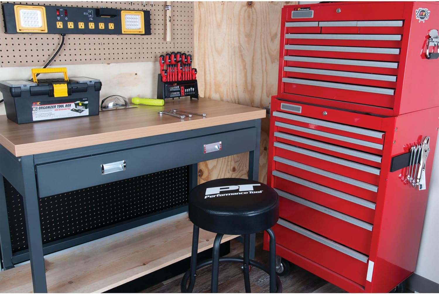 - SWIVEL SEAT: The Performance Tool W85010 Swivel Seat Bar Stool features a 14-Inch round vinyl padded seat that swivels a full 360 degrees, allowing for easy movement and access to tools while working.