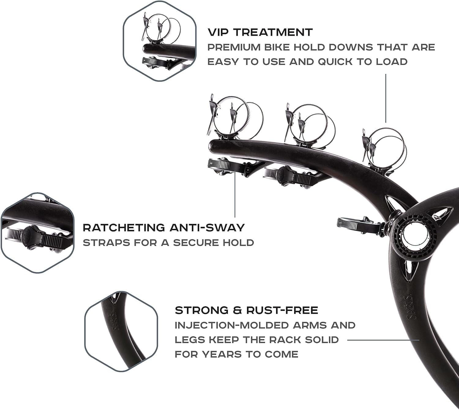- CAPACITY: Carries 3 bikes (35lb/bike), ratcheting anti-sway straps for a secure hold