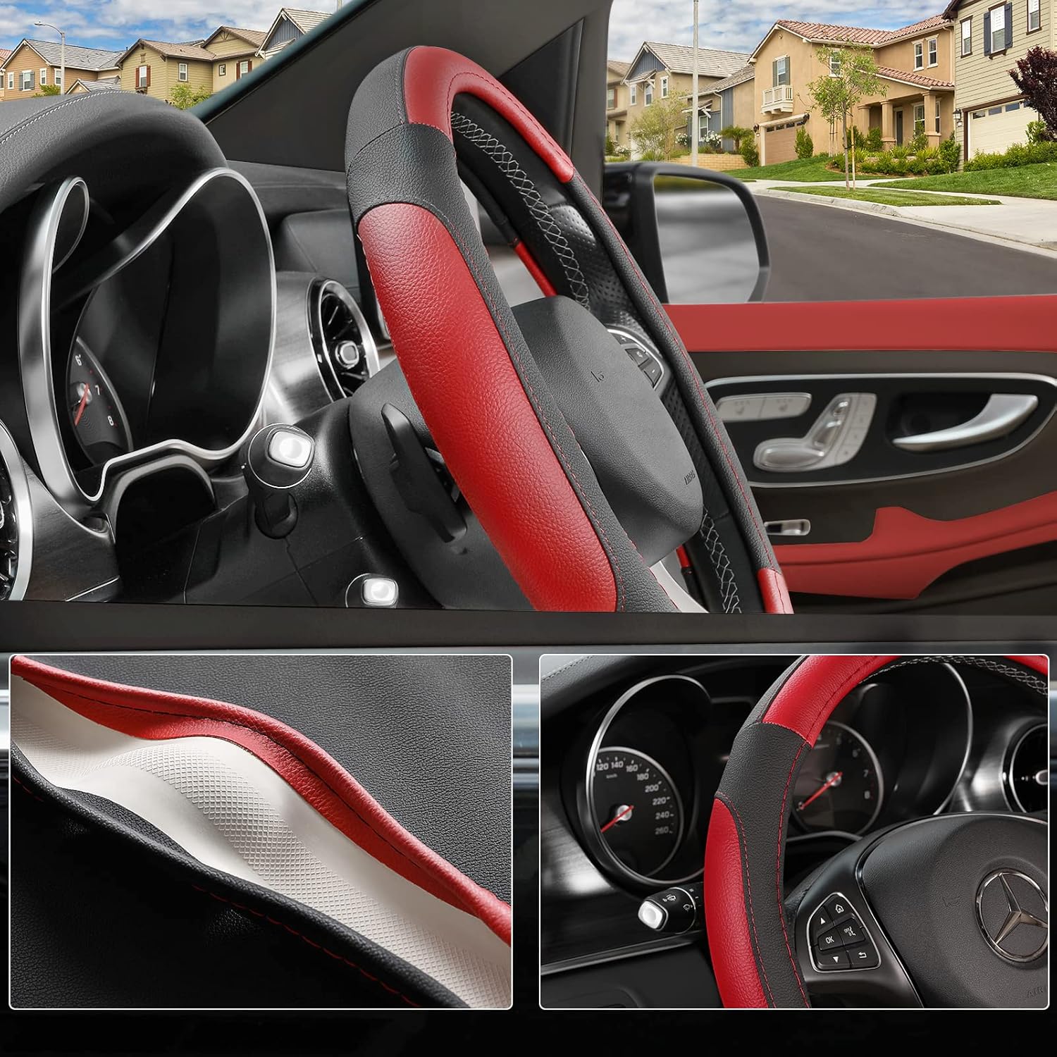 - NO MORE STICKY: The auto steering wheel cover is comfy to hold, it absorbs the hand-sweat that the summer heat causes, and allows you to grip the steering wheel much better.