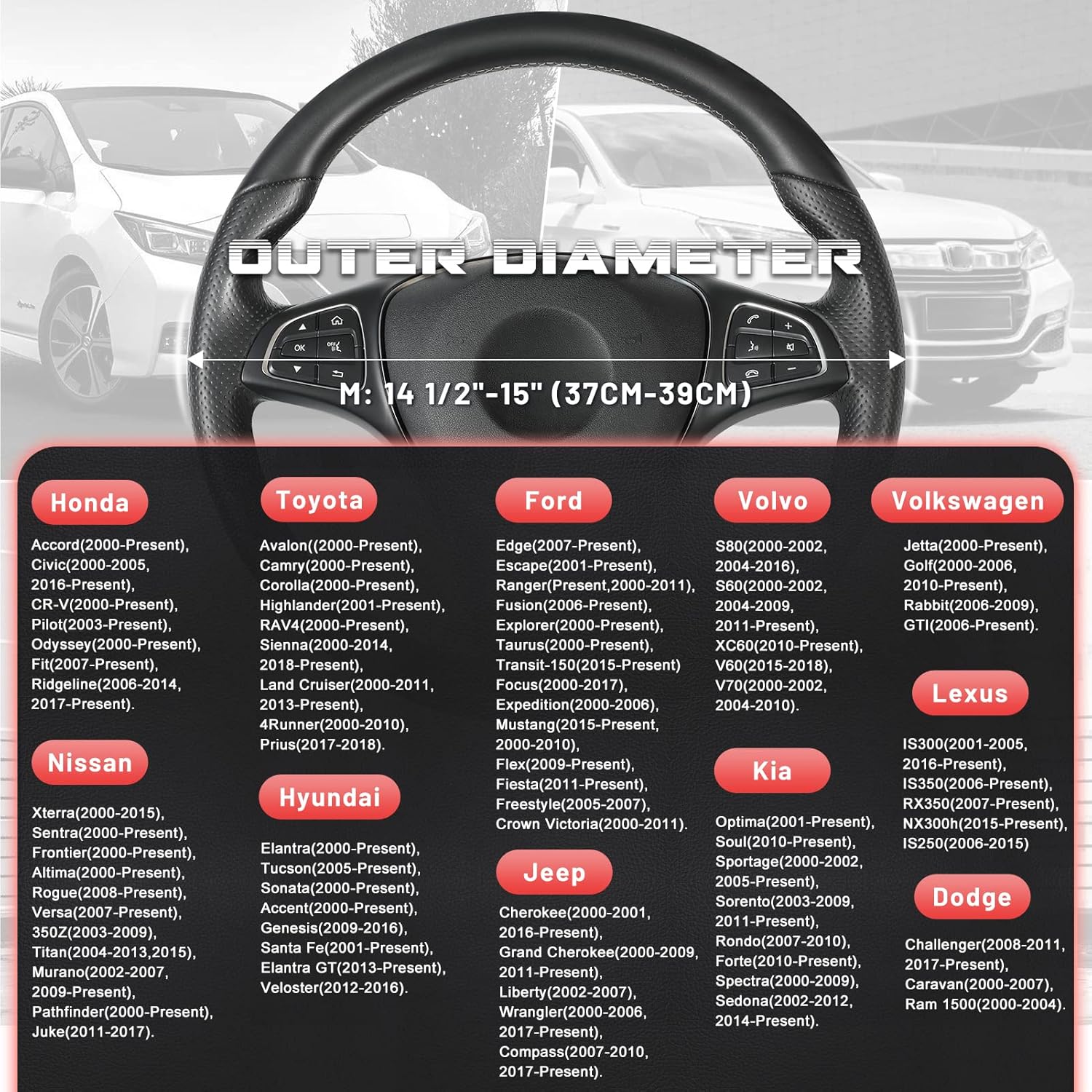 - READY TO INSTALL: Warm up the steering cover, and slip it on your steering wheel. Installation is fairly easy, any adult can install this steering wheel cover. Suitable for standard size steering wheels with outer diameter of 14 1/2-15 inches, please carefully measure the size of your steering wheel before purchasing.