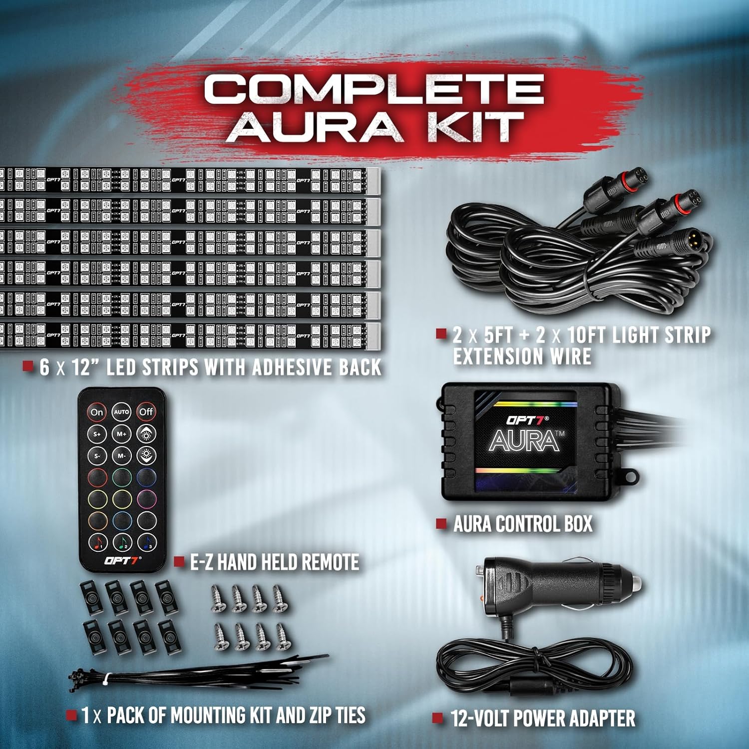 - Included Components : 1 x 21-Key Handheld Remote, 1 x Aura V2 Control Box (O), 1 x Charger Adapter, 2 x 5ft + 4 x 10ft Light Strip Extension Wire, 6 x 12" Double Row LED Strips with Adhesive Back 1 x 21-Key Handheld Remote, 1 x Aura V2 Control Box (O), 1 x Charger Adapter, 2 x 5ft + 4 x 10ft Light Strip Extension Wire, 6 x 12" Double Row LED Strips with Adhesive Back