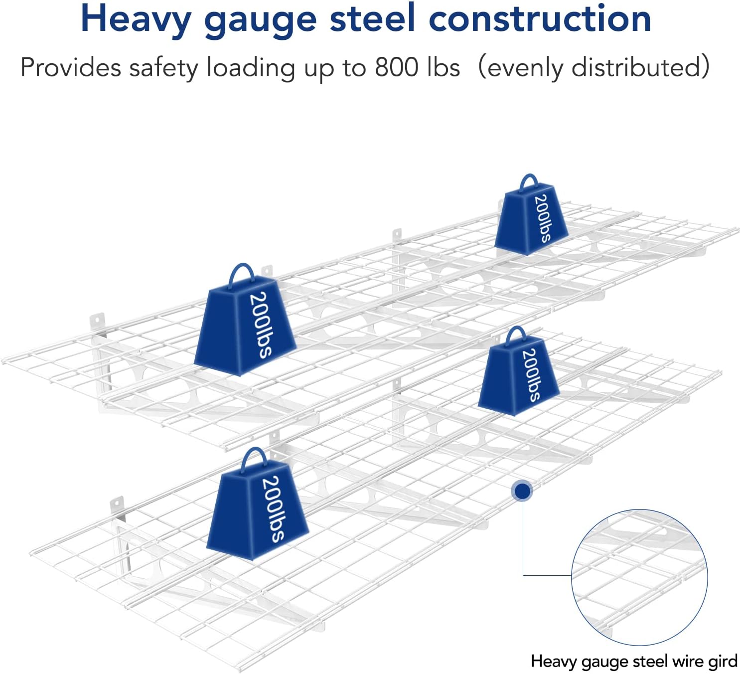 - 1600 lbs Tested, 800 lbs Total Rated Capacity: Our garage wall shelving is rigorously tested to handle a total of 1600 lbs, ensuring unmatched safety and durability. It supports up to 800 lbs in total and 200 lbs for each individual unit.