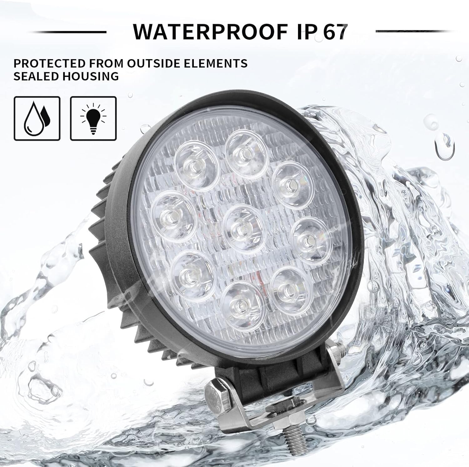 - IP67 waterproof and dustproof,Stainless steel mounting brackets, fit offroad and other use Conditions. 【Waterproof and Shockproof】: IP67 waterproof rating and Eco-friendly low power consumption design with integral heat sink to keep the working temperature down and make led in cooler condition, and allow lamp have longer lifespan.