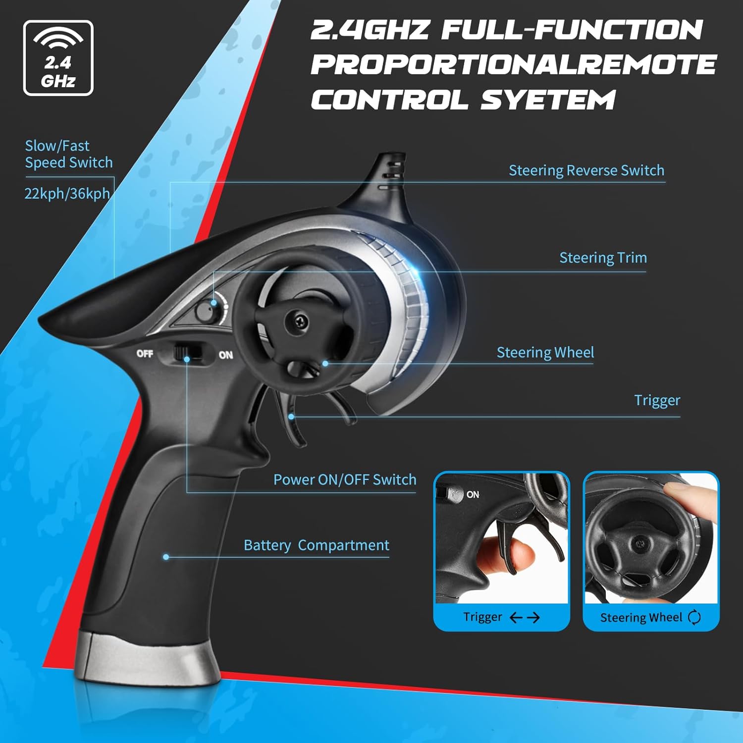 - 2.4GHz full-function proportional radio control system suffices a stable control range within 280 feet. Reliable transmission forward, brake and reverse would quick response(ensure the correct method to pair the vehicle with the transmitter). Splash waterproof electronic components make a all-terrain vehicle out of this truck. No worries to run this remote control cars on short grass, gravel roads, and concrete ground.
