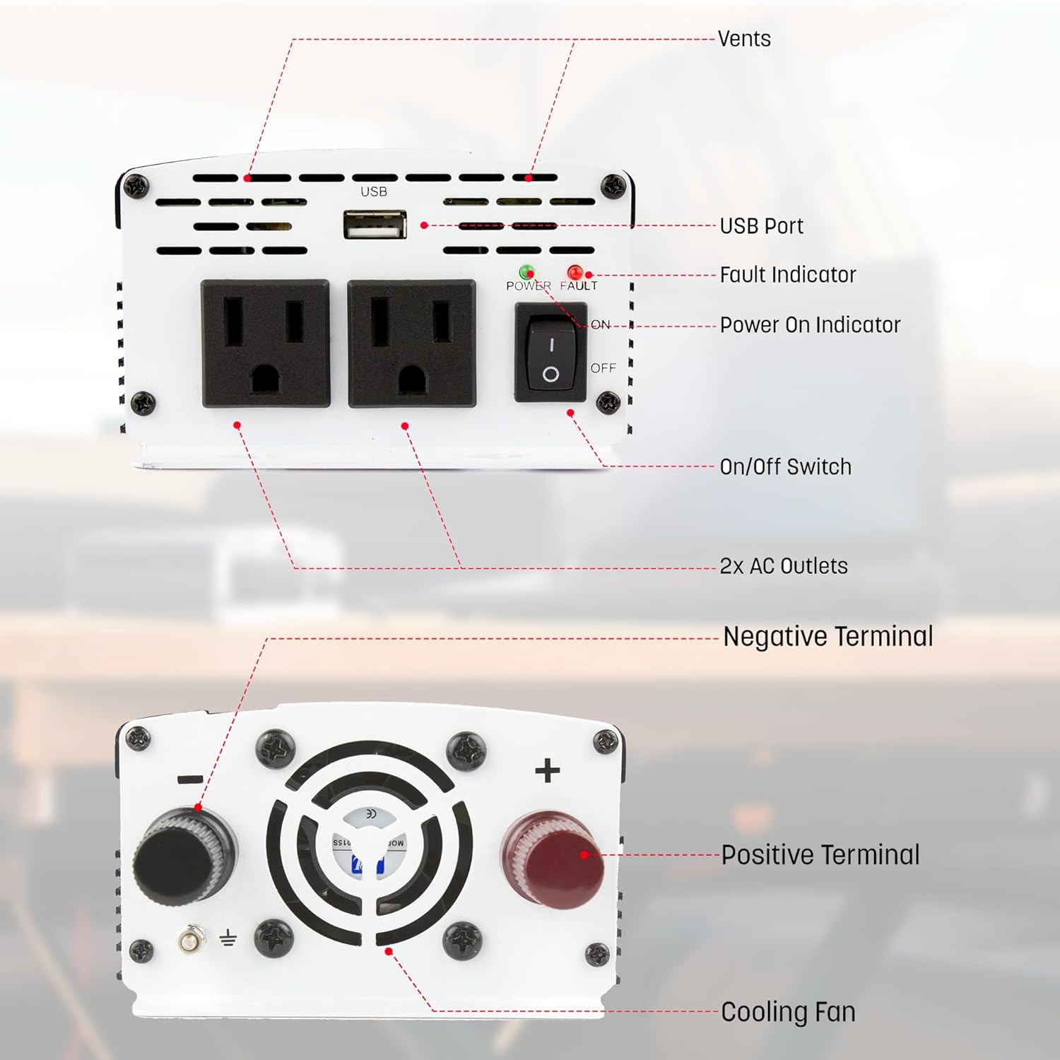- 2 standard US 3-prong AC outlets, a 2. 1A USB Power Port, Red fault LED light, Green Power LED light, Cooling Vents, Power switch, and the front mounting flange