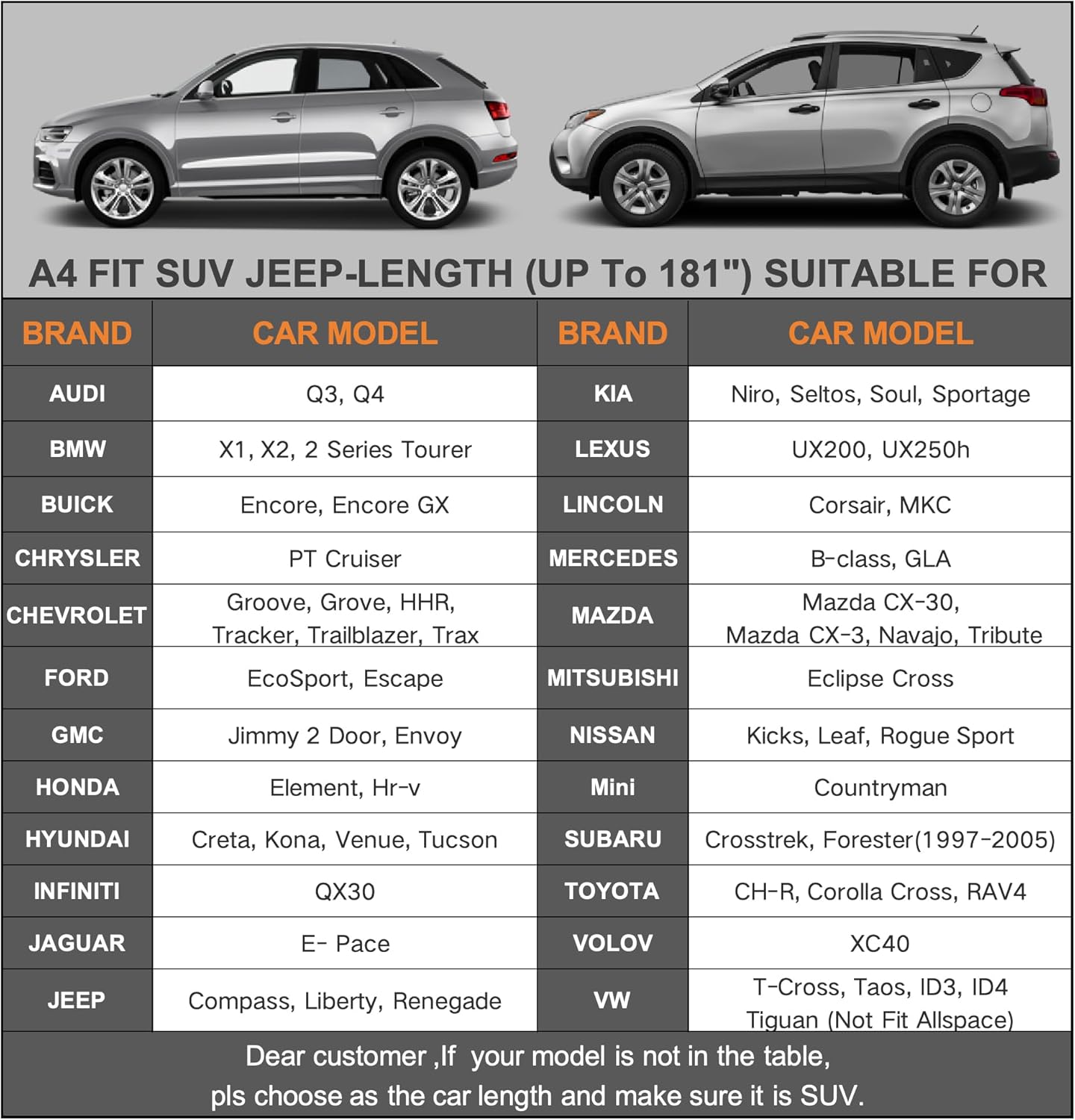 - ăDimension A4ăâ Universal fit for Suv Jeep which length is up to 181 inch (NOT FOR SEDAN AND HATCHBACK). Suitable for Audi Q3, BMW X1, Honda hrv, Hyundai Tucson/Kona, XC40, Buick Encore, Jeep compass/liberty/renegade, Kia Soul/Sportage, Subaru forester/crosstrek etc.