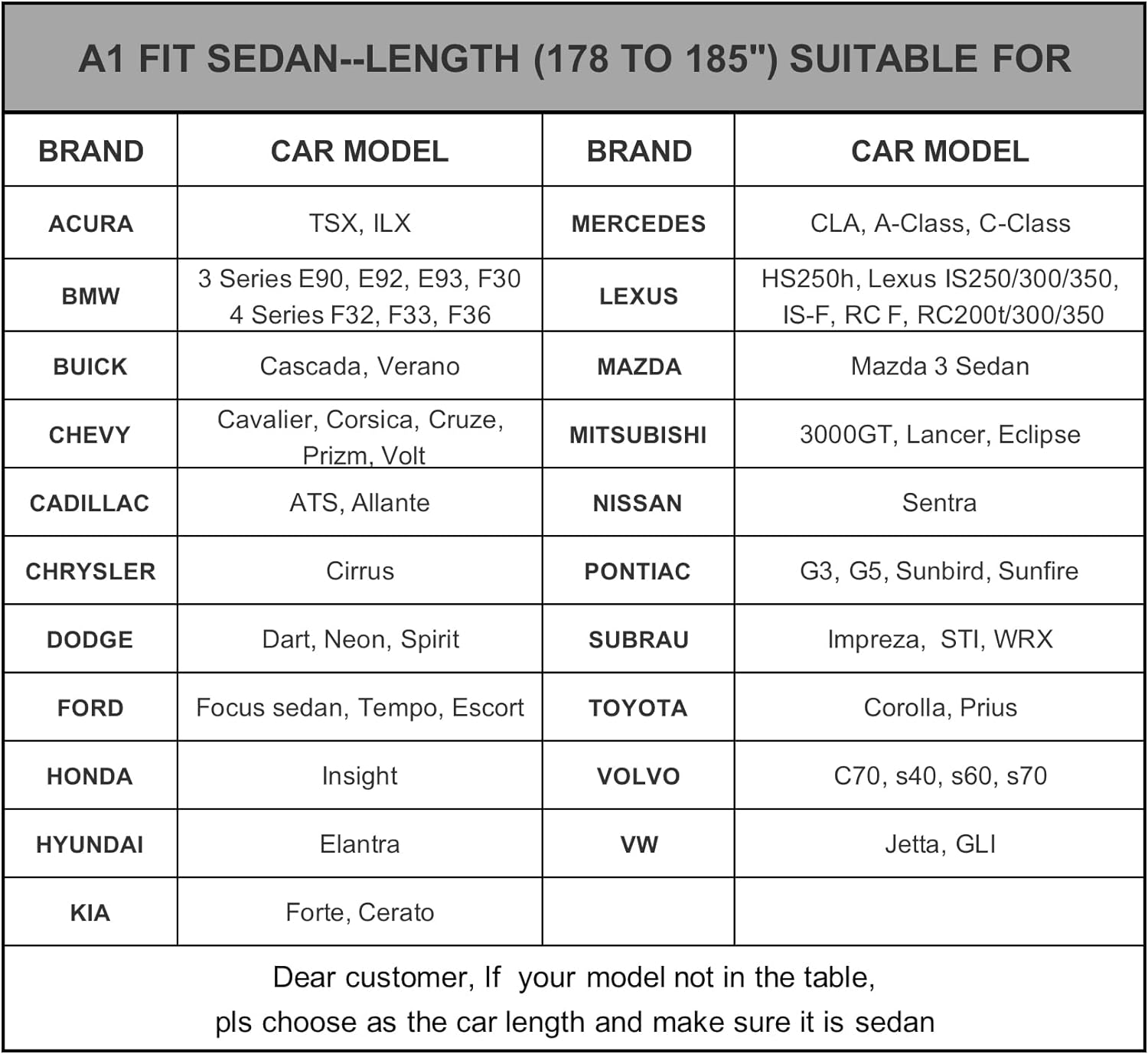 - ăDimension A1ăUniversal fit for sedan which length is 178 to185 inch (NOT FOR HATCHBACK AND SUV ). Suitable for Toyota Corolla/ Prius, BMW 3/4 Series, Ford focus sedan,Hyundai elantra, Kia forte/cerato, Lexus is250/300/350, Mitsubishi lancer/Eclipse/3000, Nissan Sentra, Subaru impreza/wrx, vw Jetta etc.