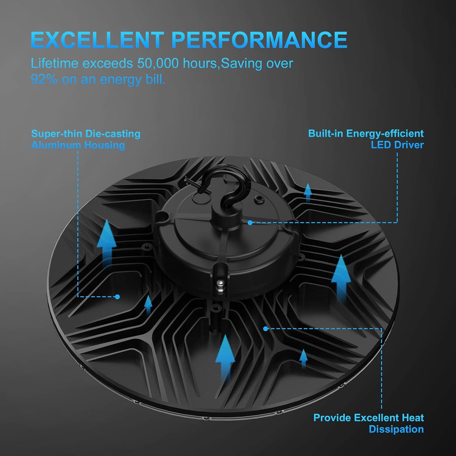 - Commercial-Grade Lighting Efficiency -- Our commercial bay lighting maximum output of 36000lm. 240w ufo led high bay light uses high-efficiency LED chips SMD2835 which can reach 150Lm/w, Saving 90% electric bill instantly. Ensuring safe, shadow-free environments for warehouses, workshops, and large facilities.