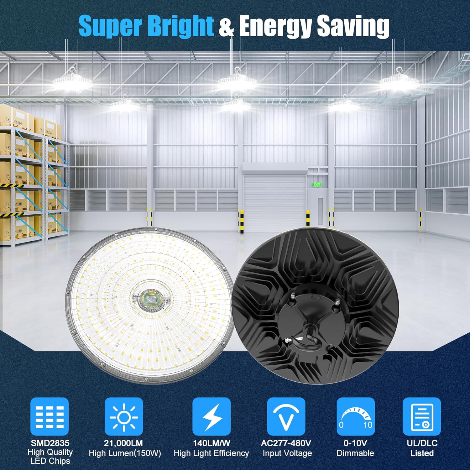 480V LED High Bay Light UL DLC Listed 150W 100W 80W Adjustable 5000K UFO Light 0-10V Dimmable IP65 Waterproof High Bay LED Shop Lights for Factory Warehouse (AC 277-480V)