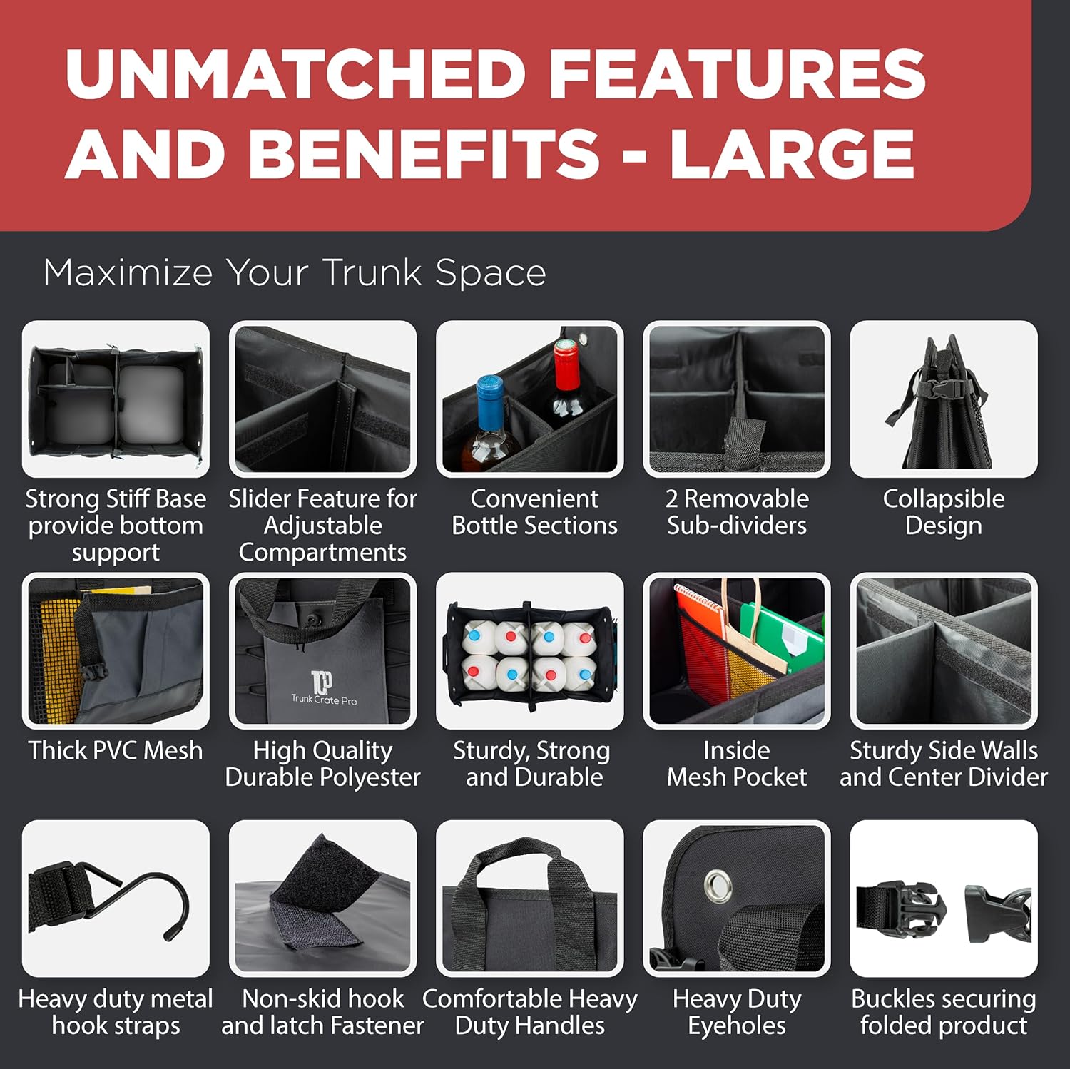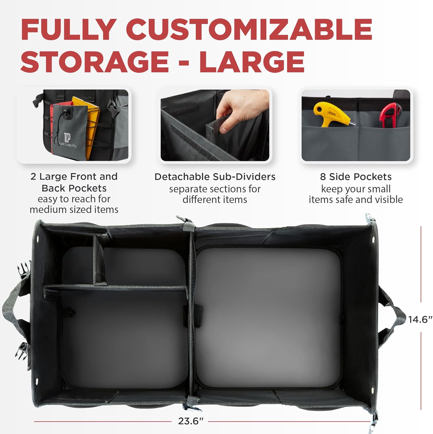 - SIMPLY THE BEST - LeClassiqueShop, presents the highly anticipated, unique and EXCLUSIVE trunk organizer to the Trunk Crate Pro (TC-Pro) (Patented) brand. Our car storage organizer is an Eco-Friendly professional grade, Heavy Duty Material trunk organizer with straps: Best for suv, car, truck, auto, jeep, mini van, vehicles in Automotive Interior Car Accessories. It is hand crafted using premium highest grade Oxford Polyester material. Size is 23.6" (L)*14.6" (W) * 12.5" (H)