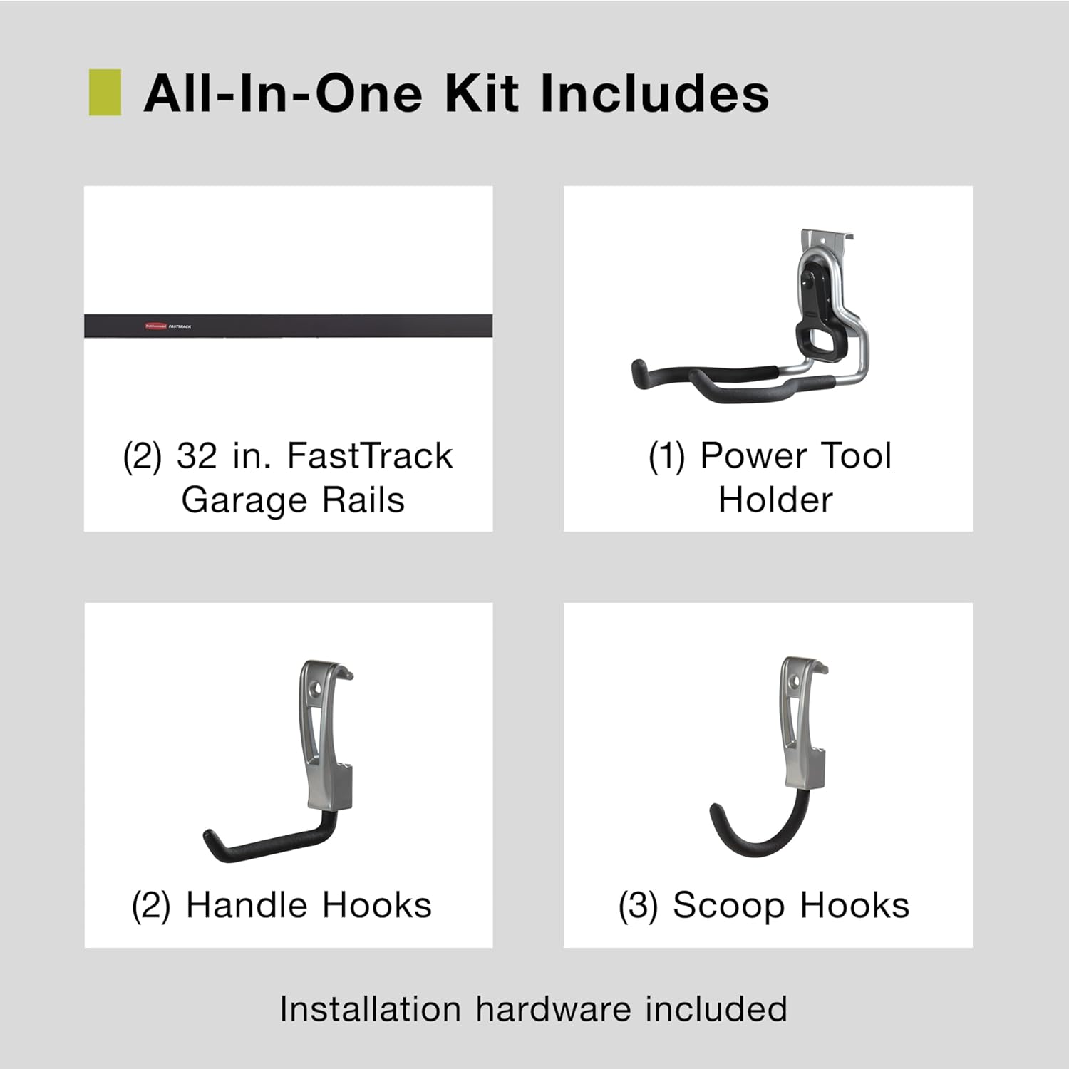Rubbermaid Garage FastTrack 8-Piece Small Kit Black/Grey All-in-One Rail & Hook Wall Hanging Kit Wall Mounted Storage Solution for Home/Garage