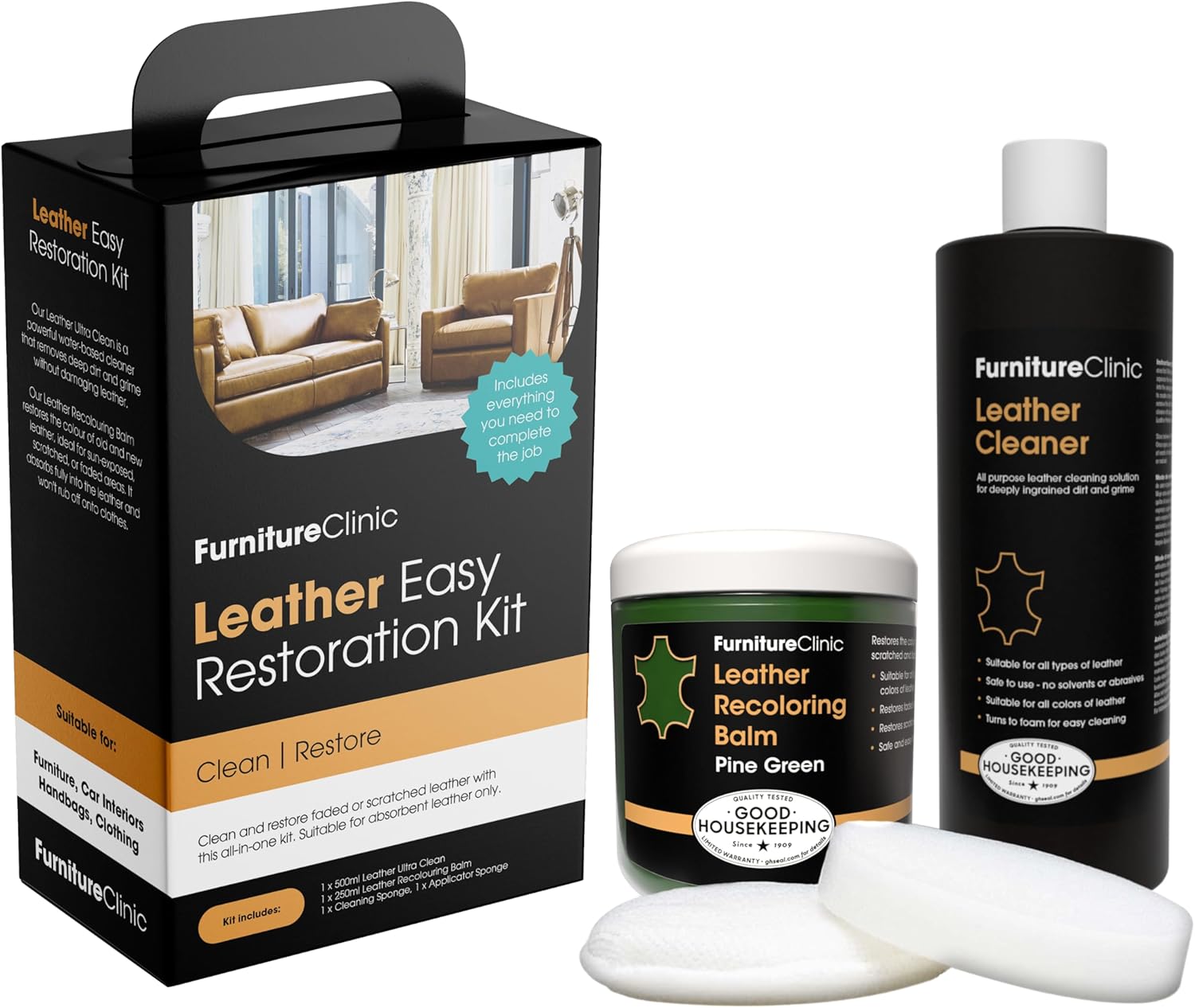 Furniture Clinic Leather Easy Restoration Kit | with Leather Recoloring Balm, Cleaner, Sponge, and Cloth | Leather Repair Kit for Scratched and Faded Furniture (Pine Green)