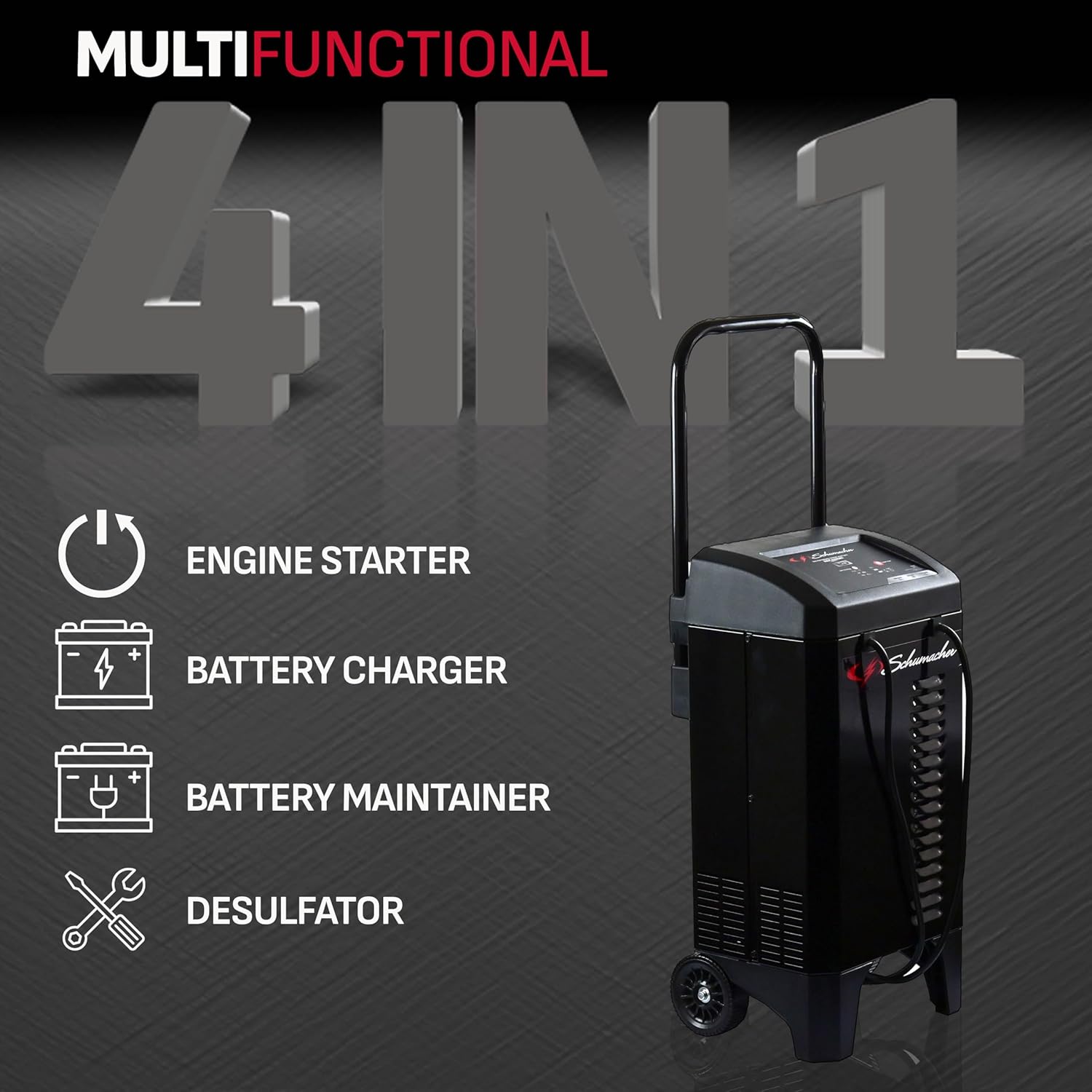 Schumacher Electric 4-in-1 Wheeled Battery Charger, Maintainer, and Engine Starter, SC1324, Fully Automatic, 200 Cranking Amps, 40 Amp Boost, 12V, for Car, Truck, and Other Large Vehicle Batteries