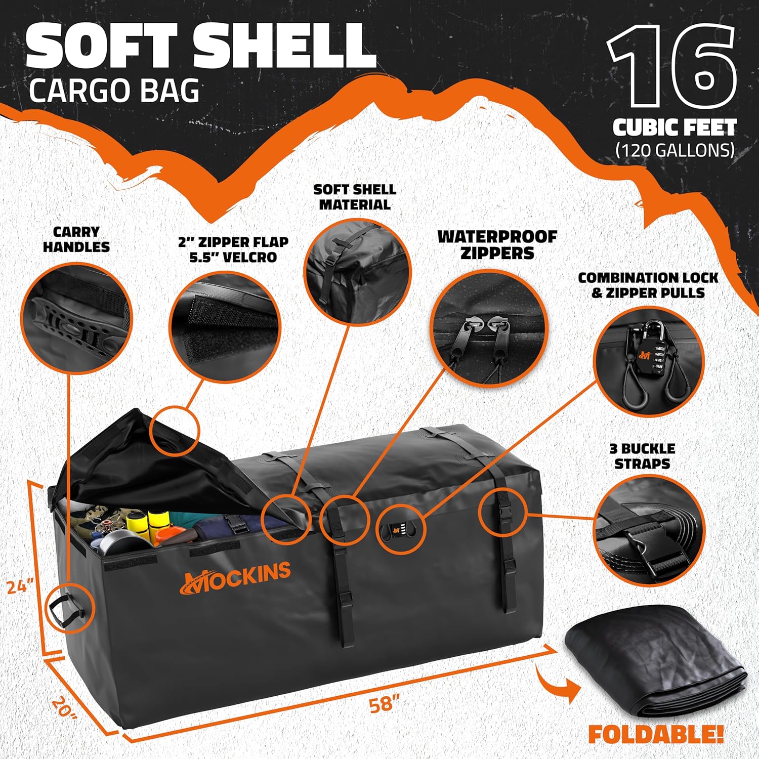 - ALL-WEATHER CAR CARRIER BAG : Our luggage carrier cargo racks for trailer hitch come with a truck bed waterproof storage bag, measuring 58"x24"x20" with 16 cubic ft. of trailer hitch storage capacity. Built from abrasion-resistant vinyl with waterproof zippers, the Mockins Hitch Mount Cargo Carrier Bag handles harsh weather conditions. Reinforced seams, a 2" protective flap, & 5.5" Velcro strips enhance moisture resistance, making this folding cargo hitch carrier with bag set road-trip ready.