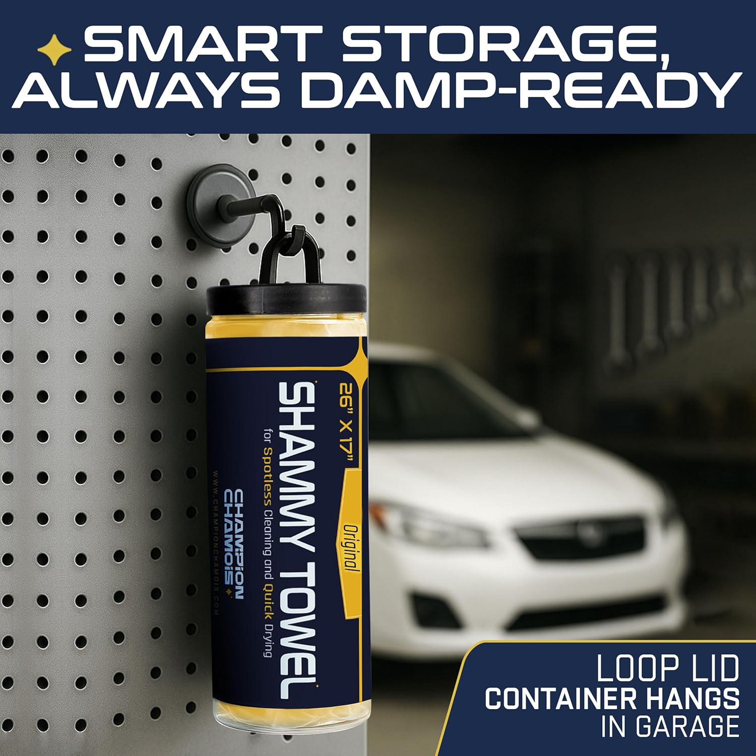 - REUSABLE - Our car wash shammy is built for years of use. It retains its absorbency wash after wash and is designed to withstand tough conditions. They're easy to maintain — just wash off dirt, wring out excess water, and store in the included container!