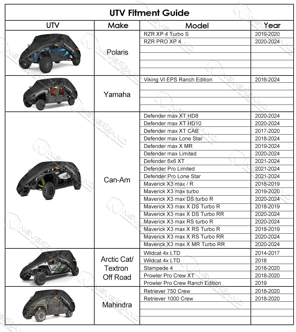 - [Fits Most 4-6 Seats]: You can refer to the compatibility table given on the chart, our covers are compatible with polaris, rzr, yamaha, can-Am defender, kawasaki mule ranger etc. Up to 169" in length, please check UTV sizes carefully before purchasing