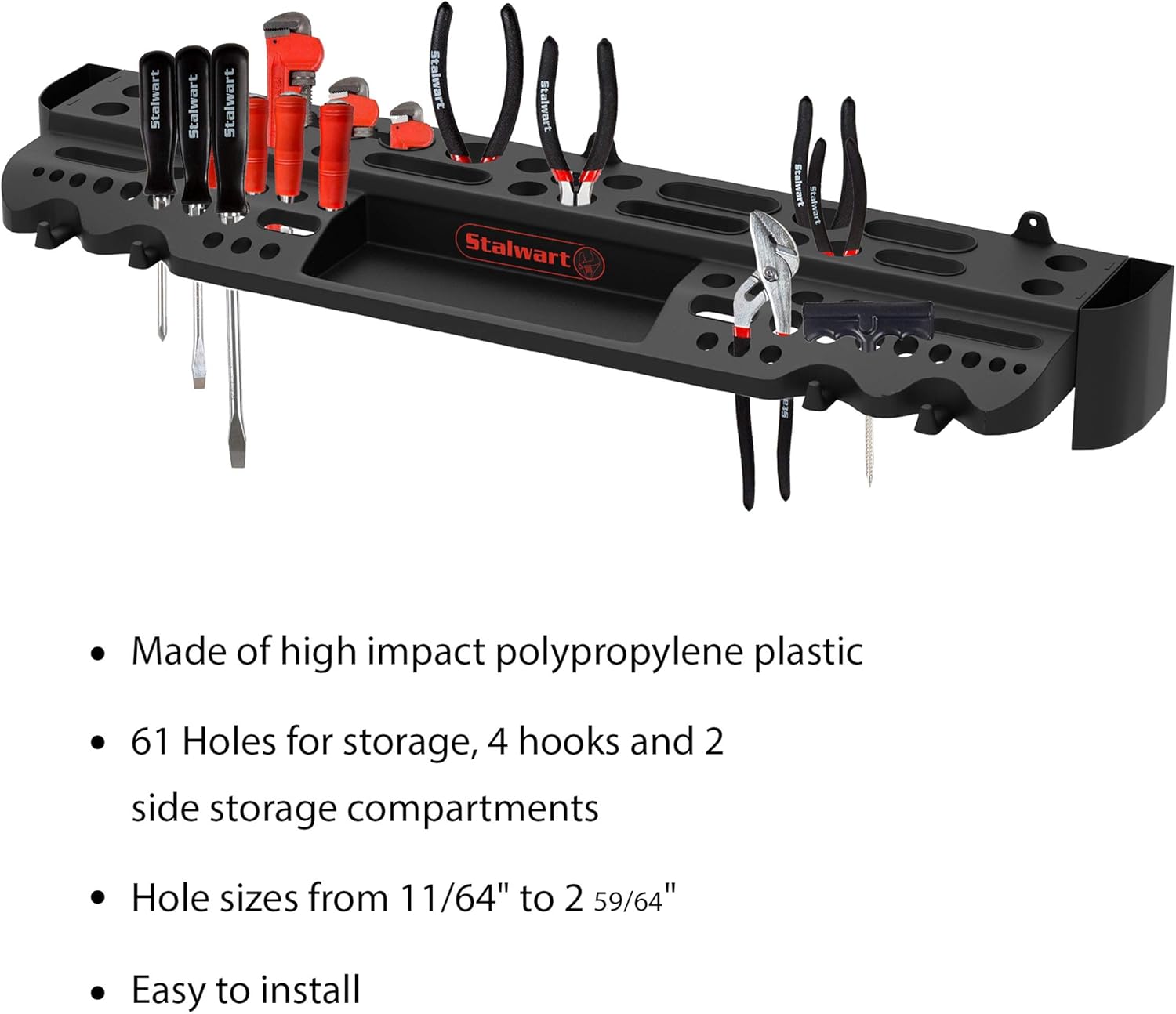- PRODUCT DETAILS - Material: Polypropylene Plastic. Dimensions: (L) 29"x (W) 4"x (H) 6.25". 61 Tool Slots, 4 Hooks, 2 Side Compartments. Color Black.