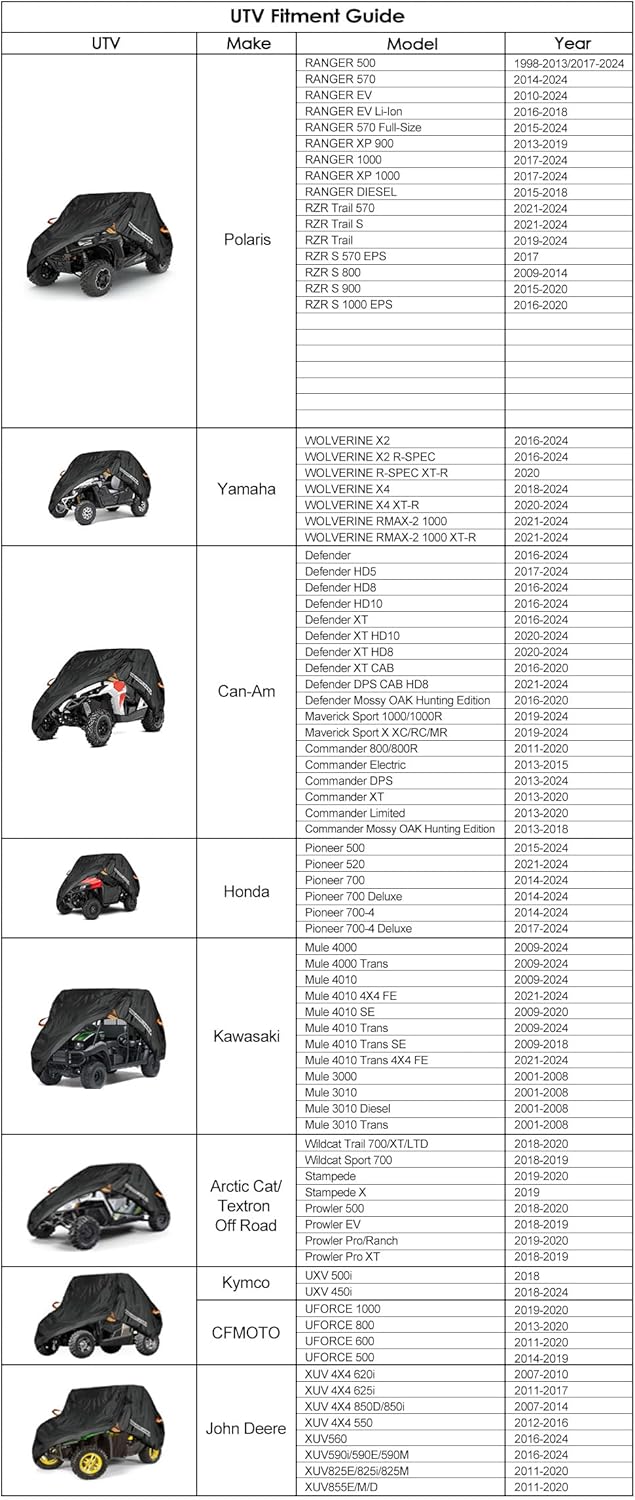 - Fitment Models ïŒNEVERLAND UTV cover fits for Polaris RZR Yamaha Can-Am Defender Honda Pioneer Teryx Mule / Single Row Seats UTV (2-3 Passenger), â Please note : only for Single Row Seat! Please check your UTV MODEL YEARS as well as the UTV Fitment Guide before you making an order! If you still have doubts , please feel free to ask us