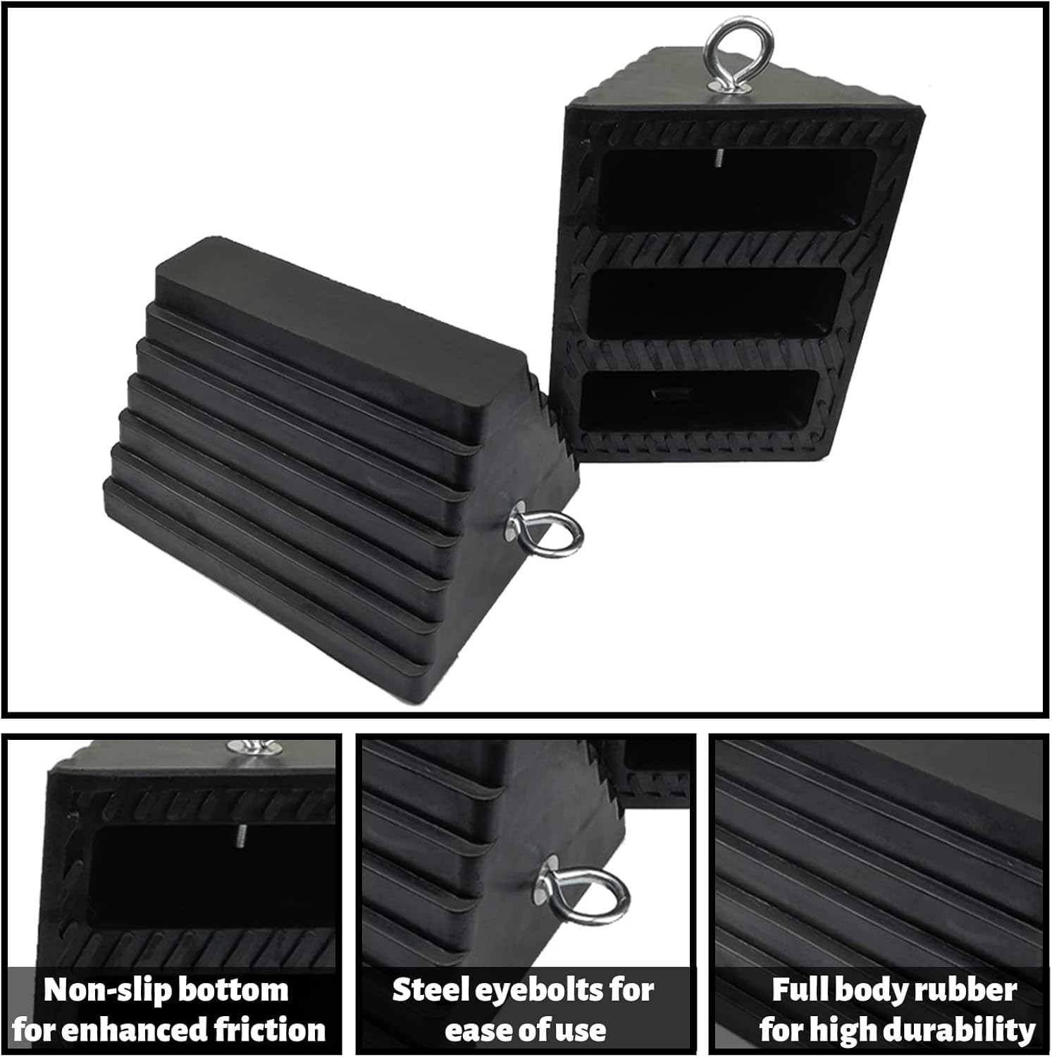 ROBLOCK 2 Pack Wheel Chocks Rubber Heavy Duty Black with Eyebolt, 9" Length x 7.1" Width x 5.5" Height, for Cars, RVs, Trucks, Trailers, and Vehicles, Anti-Slip Design Tire Chock for All Weather Use
