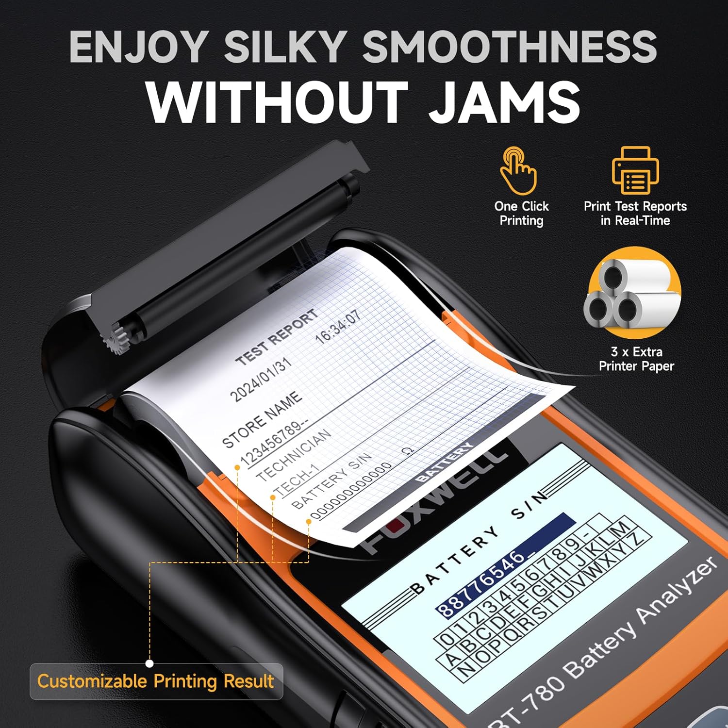 - PRINT REPORTS AT NO EXTRA FEE - Print clear, professional test reports in seconds with voltage, CCA, SOC/SOH, and cranking details, and save time and money with the battery tester with printer that includes 3 free rolls of 57Ă—30mm paper and affordable replacements available online.