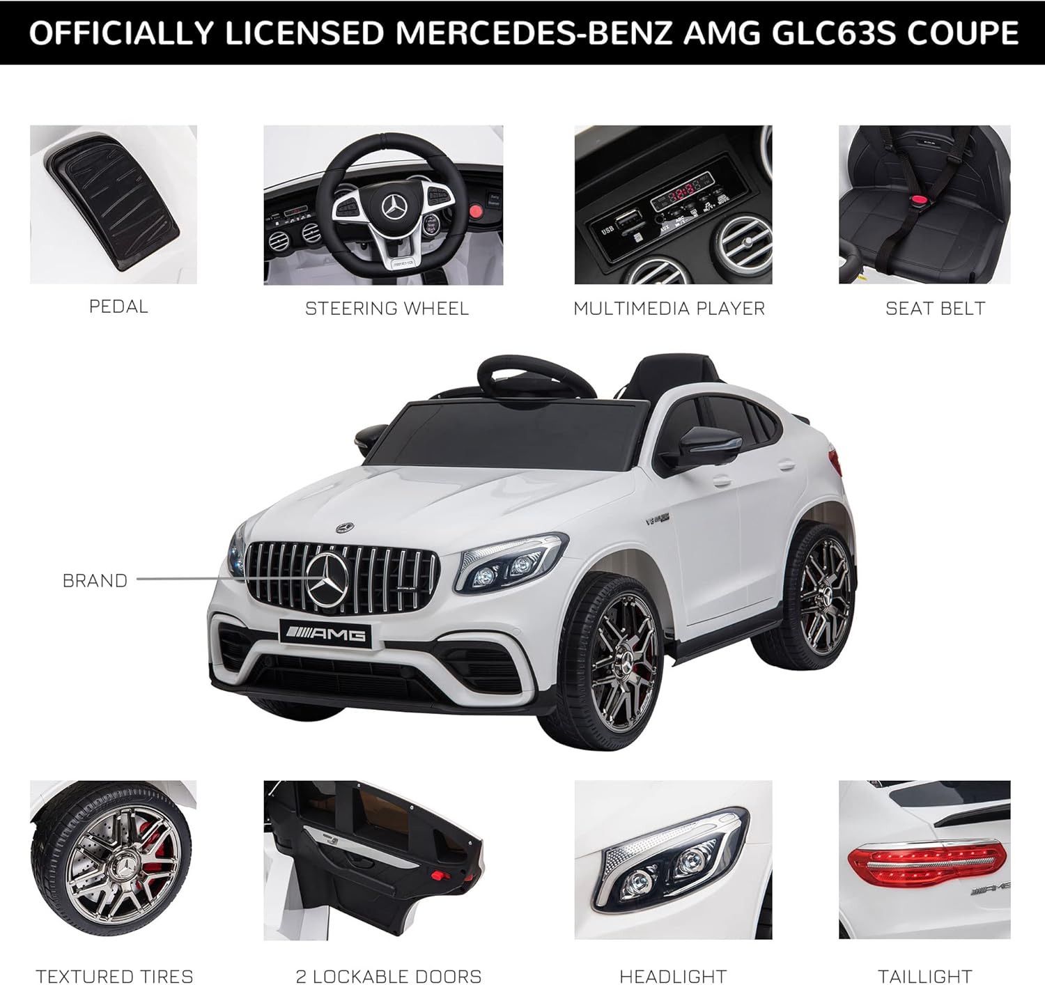 - Looks Like The Real Thing: This officially licensed Mercedes-Benz AMG GLC63S Coupe ride-on sports car has the authentic look of a real Mercedes-Benz vehicle in a fun, kid-sized driving package. It features working front and taillights, a button start, and a double door with a safety lock.