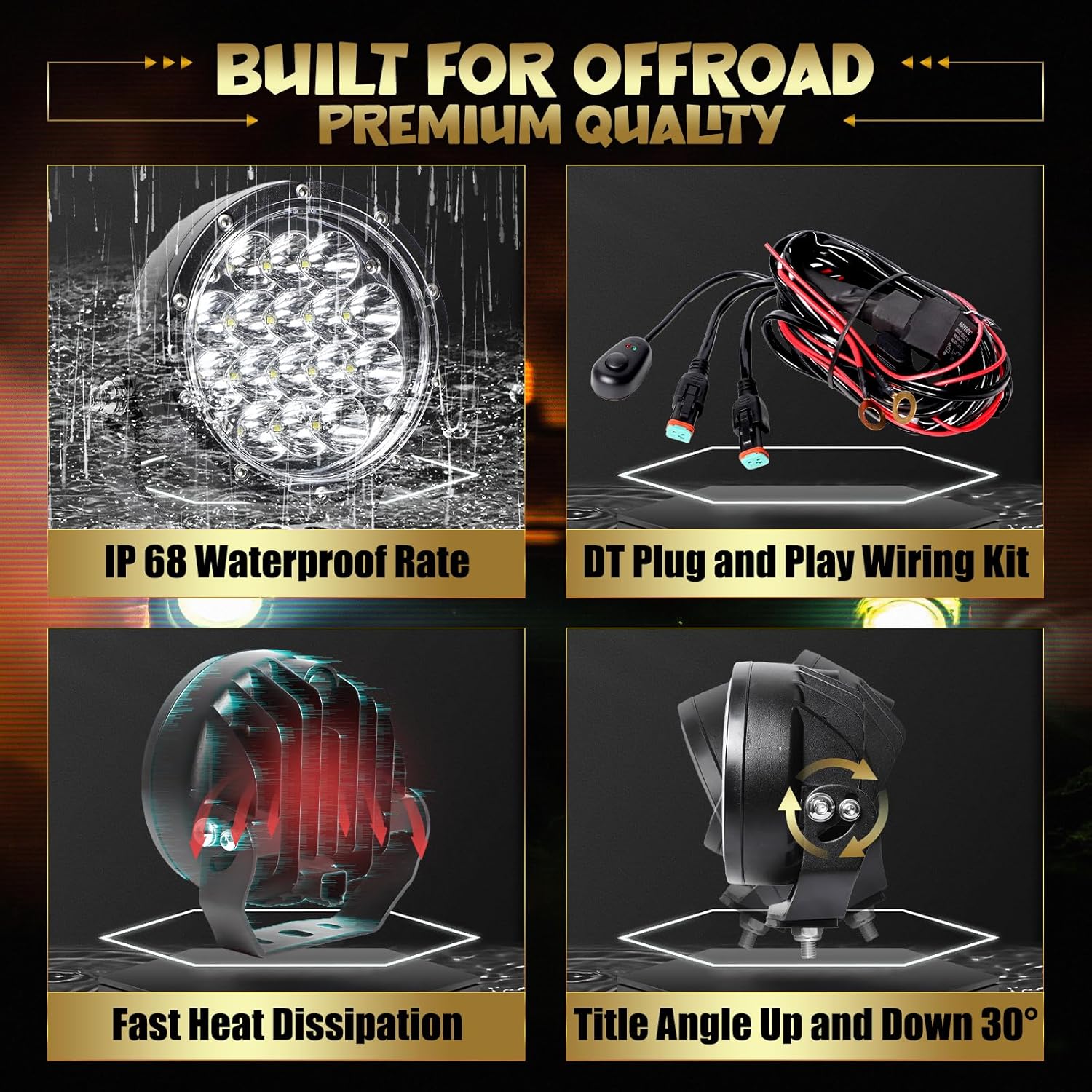 - [Package Included] 2 pcs lights, DT paly and plug 16AWG Wiring Harness Kit, one set diffuser covers and one set yellow protecting covers, essential harewares. Operating voltage range between 9V-32V. With adjustable mounting brackets, this led driving light is well suited for Jeep Wrangler, Pickup SUV, ATVs, trucks, UTVs, and a variety of other vehicles.