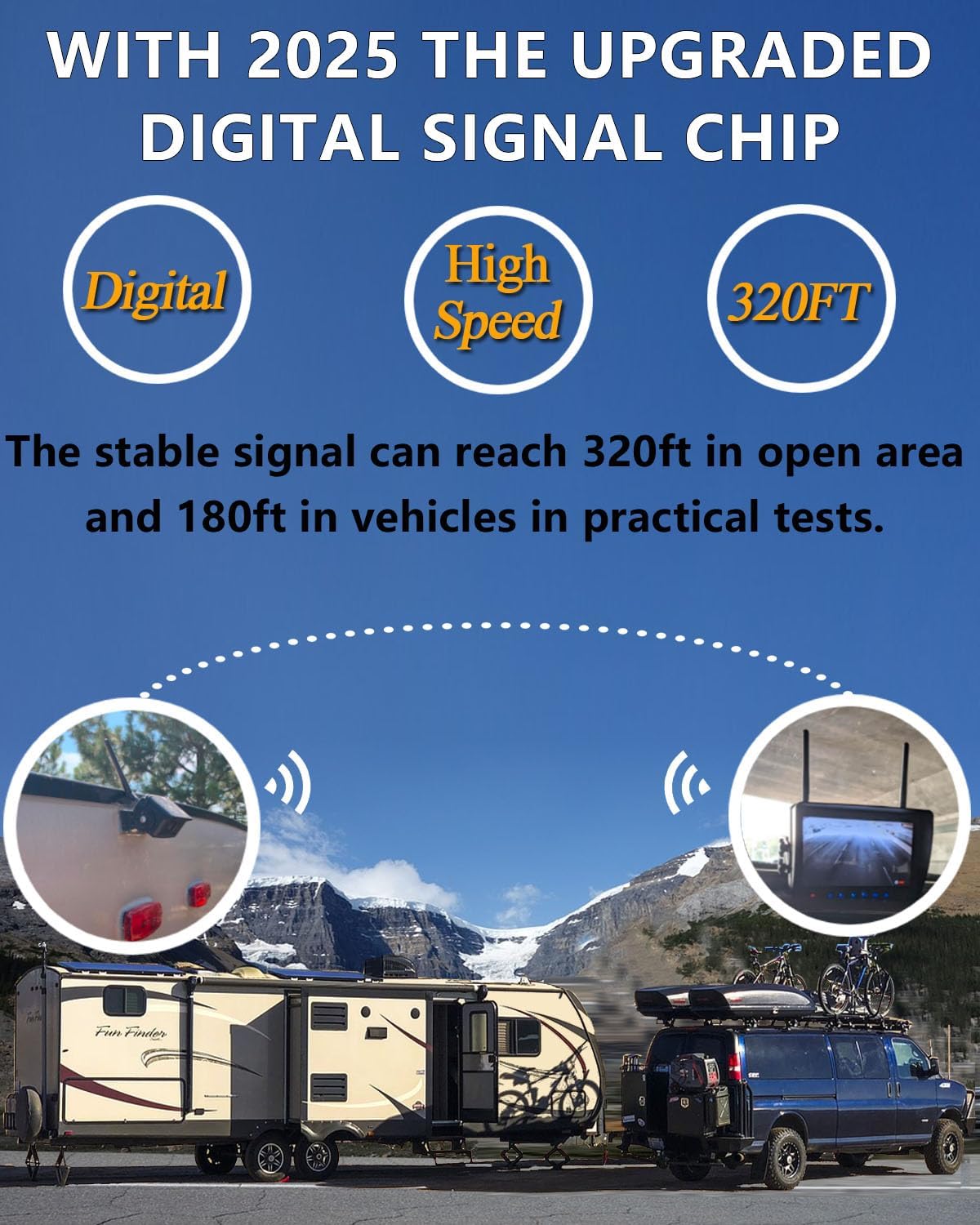 - Upgraded Wireless Backup Camera: With unique dual antenna design and the latest digital signal chip, the wireless backup camera can send 1080P videos to the display via the stronger signal. The signal can reach 320ft in open area and 180ft in vehicles