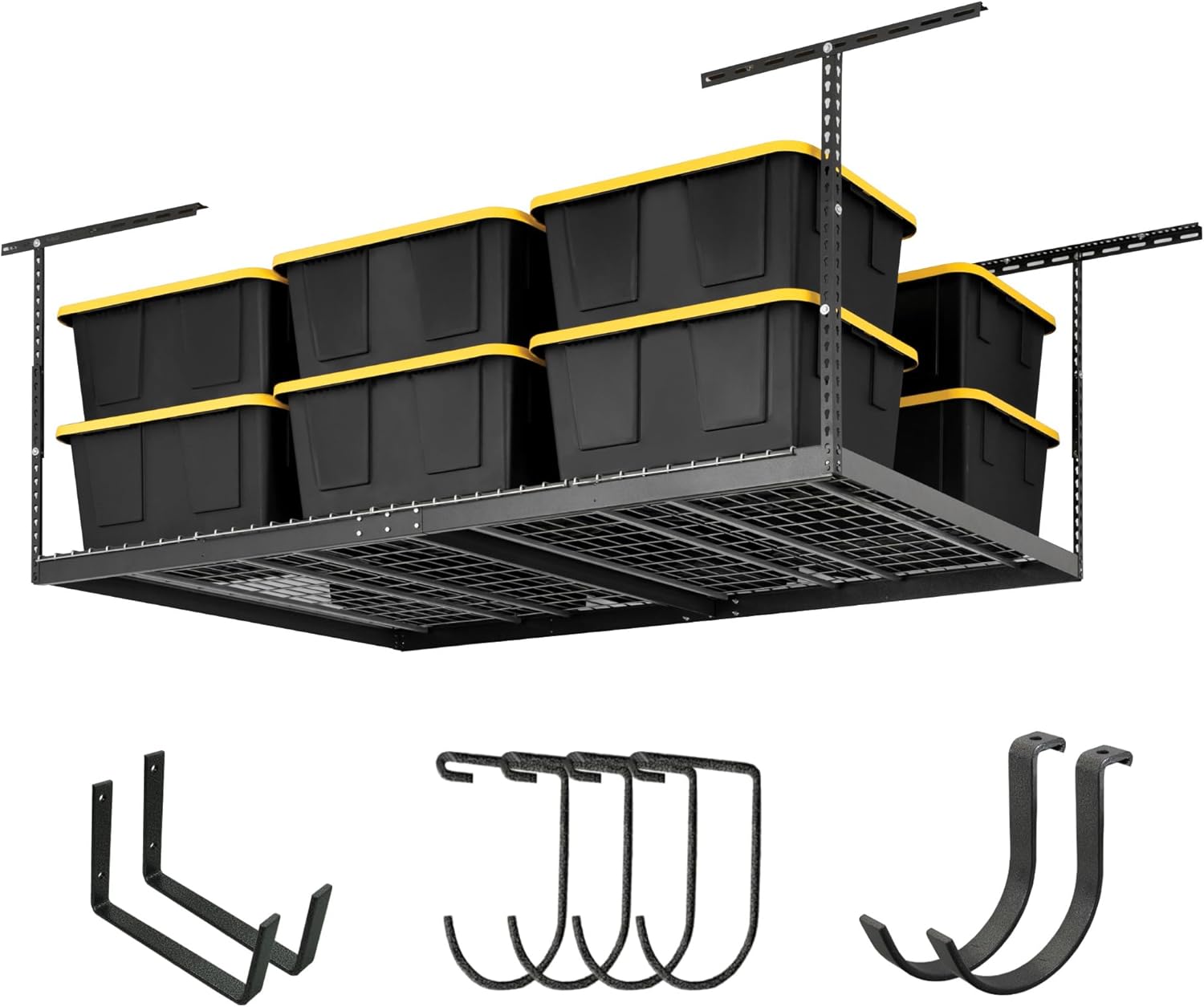SafeRacks Overhead Storage Rack - Heavy Duty, 600 lb Capacity, Adjustable, Ceiling Mount for Garage 4x8 Hammertone (12"-21")