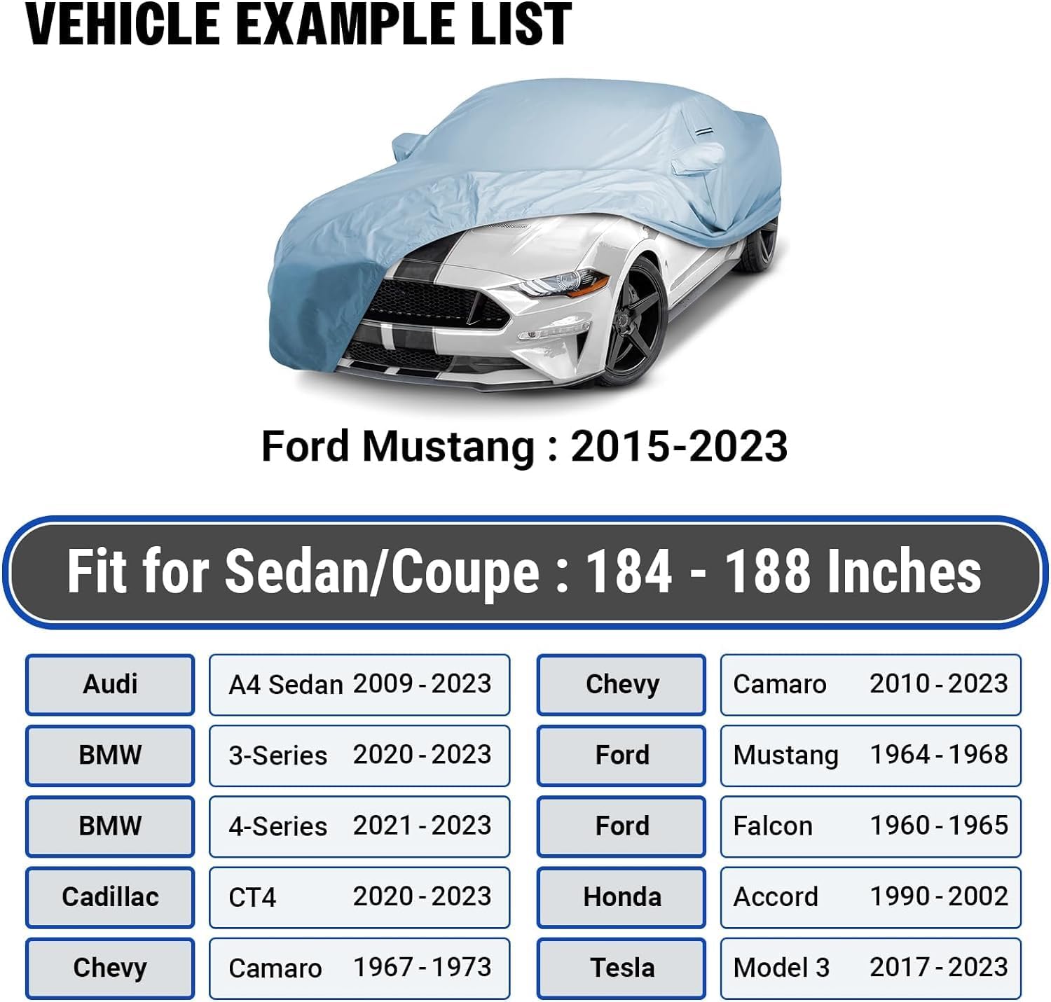 iCarCover 18-Layer Car Cover Waterproof All Weather, Premium Quality Car Covers for Automobiles, UV Protection, Ford Mustang, Camaro, XK, 4-Series, M4, Supra, Thunderbird, Fits 184-188 Inches