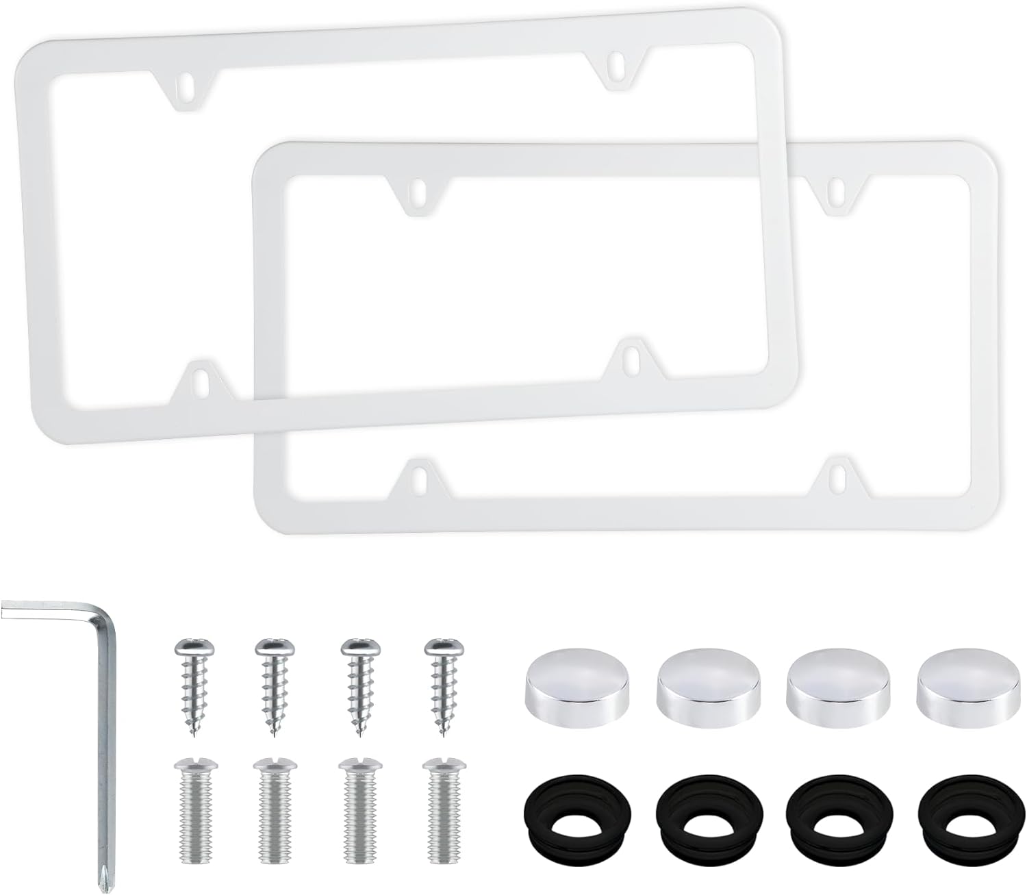 LivTee 4 Holes Stainless Steel License Plate Frames, 2 PCS Car Licence Plate Covers, Automotive Exterior Accessories Slim Design with Bolts Washer Caps for US Vehicles, White