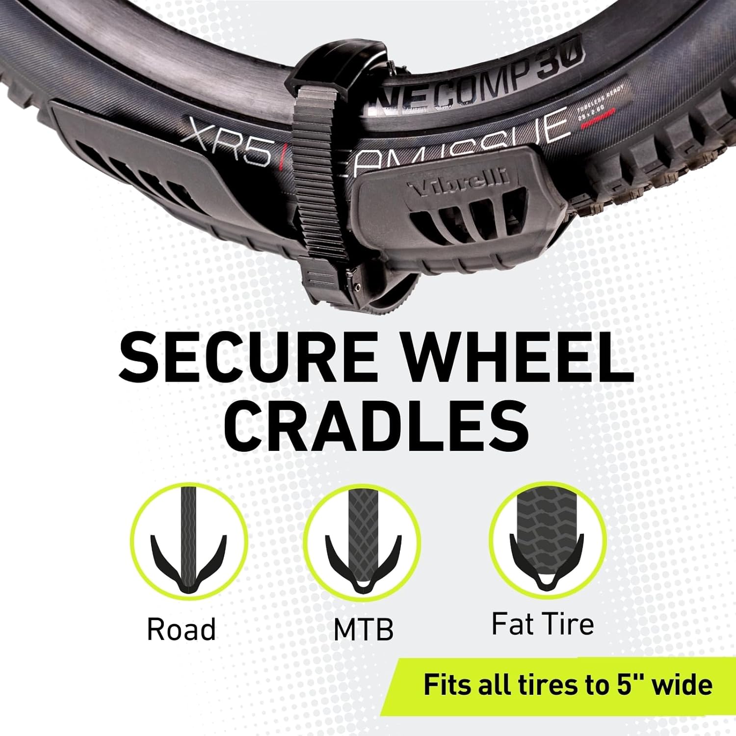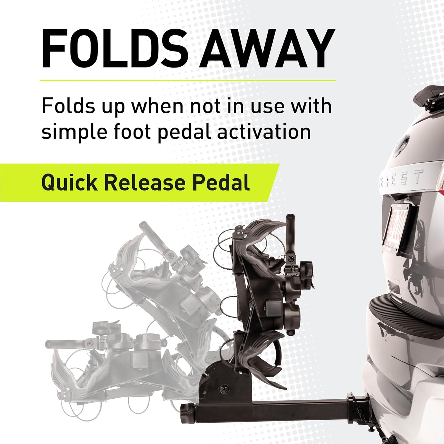 - TILT DOWN / FOLD UP - Quick release pedal tilts down the bike hitch rack for easy trunk access, and also folds up out of the way when not in use. WHEEL CRADLES - Snugly fit both narrow and fat bike tires up to 5 Inches wide. Ratchet straps hold wheels securely in place without scratching rims or damaging tires