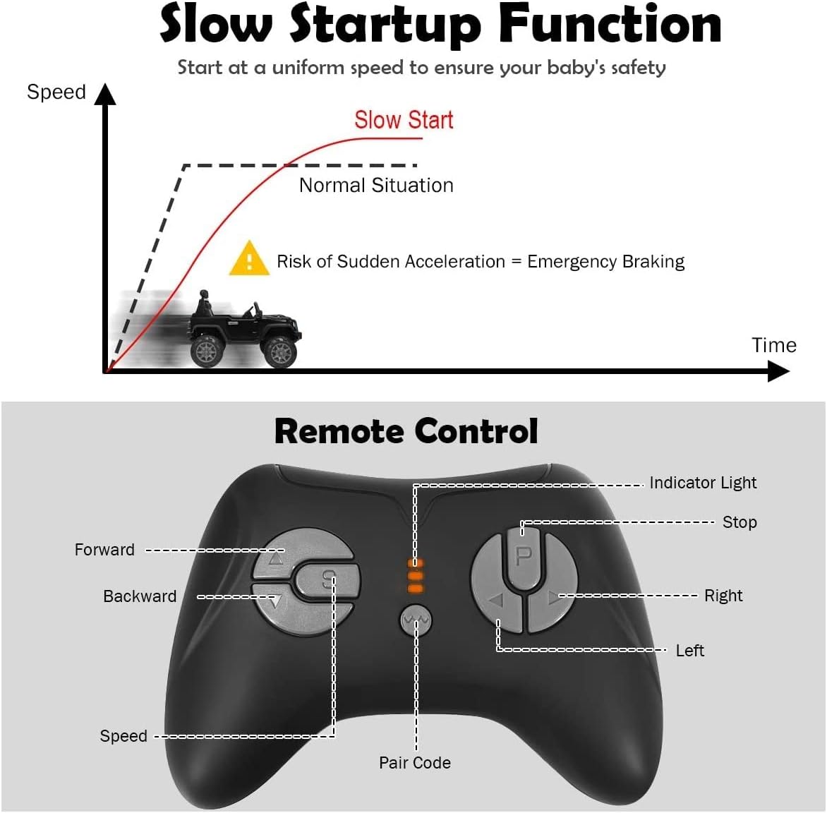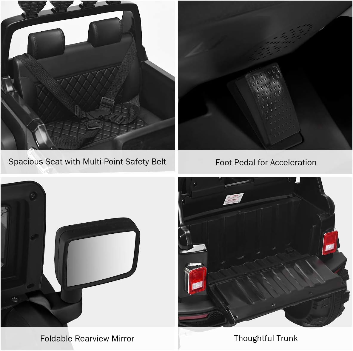 - 【Security Assurance】 The kids car is equipped with a slow start function to avoid the risk of sudden acceleration. Besides, 4 wear-resistant wheels is made of superior PP material without leaking or tire burst. Its spring suspension system and seat with multi-point safety belt offer safer driving experience.