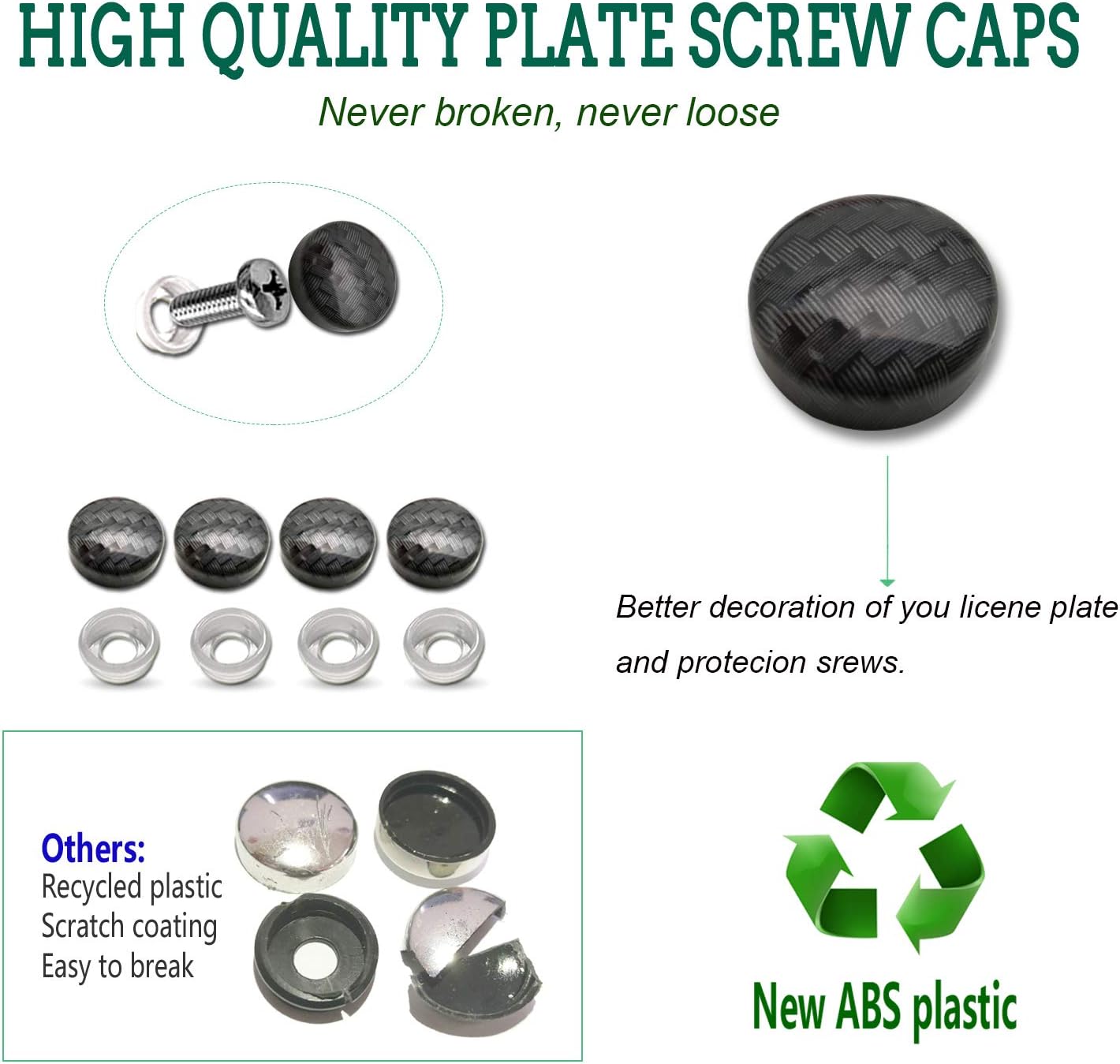 - Heavy Duty, Easy To Install- 1 pack USA National Flag License Plate cover, black aluminum frame with carbon fiber pattern(not real carbon fiber license plate frame), protected against Weather Changes and will stand Car Washes and Rain, resistant to corrosion, rust . The kit contains license plate mounting hardware, stainless steel license plate Screws, M6*20mm (1/4''*3/4'') License Plate Screws are suitable for most models. Configure with carbon pattern Screw Caps Covers, beautiful and COOL