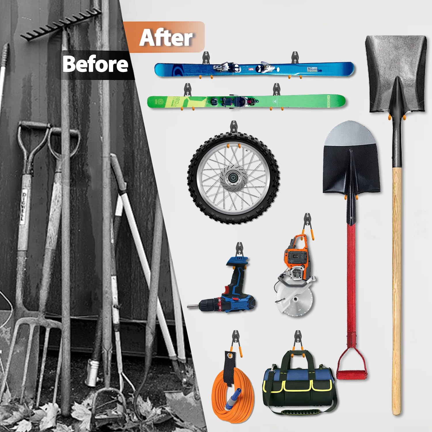 3-H Garage Wall Hooks 14 Pack, Garage Hooks Heavy Duty with Extra Welding Spots, Wall Mount Storage Organizer for Hanging Garden Lawn Tools Ladder Bike WeedEater Chair Shovel Blower (Orange)