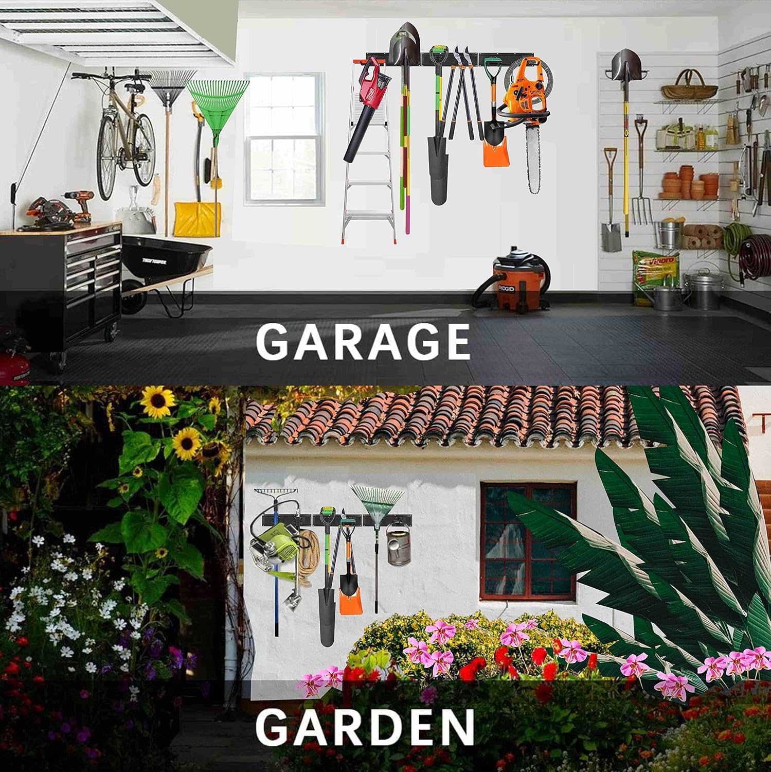 - 6 Pcs Removable Rubber Wrapped Hooks: The garden tool organizer have 6 pcs hooks. Each hook is 8.4inch, which support a variety of heavy items. They are wrapped with rubber that can protect your tools from slid and damage. These sturdy brackets glide effortlessly onto the rack & easily adjust.
