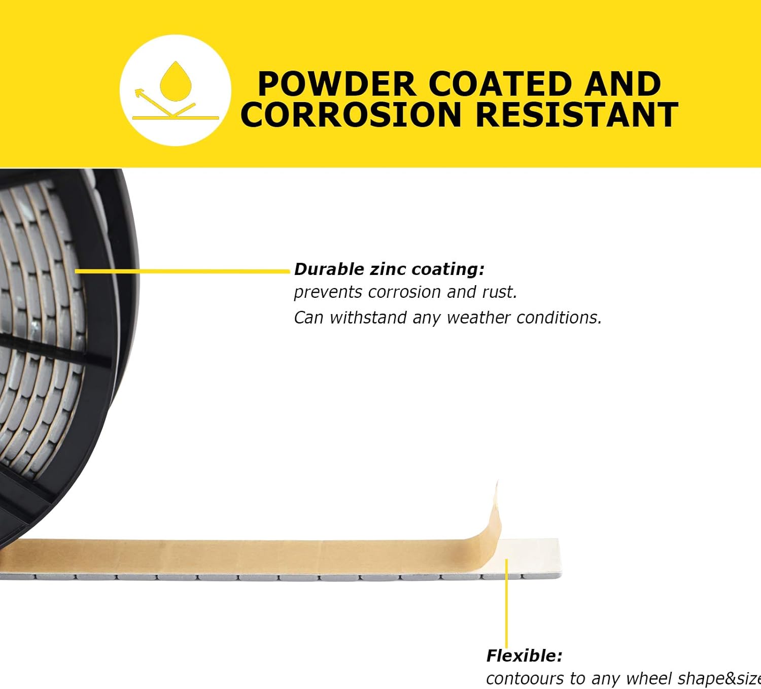 - Peel Off in 1 Second: Features a 2mm extended design, easy to peel backing makes adhering the weight to the tire simple and efficient, and it is flexible enough to fit any wheel shape and size