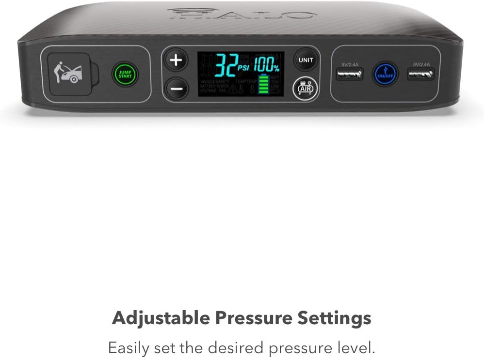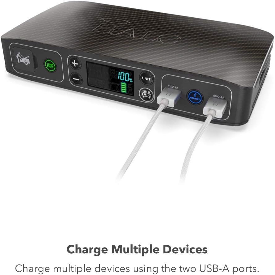 - PORTABLE EMERGENCY CAR JUMP STARTER: The HALO Bolt Air USB Power Bank can jump start a full-sized car or SUV. Everything you need to get back on the road in minutes is included. Model Number: HALO Bolt Air