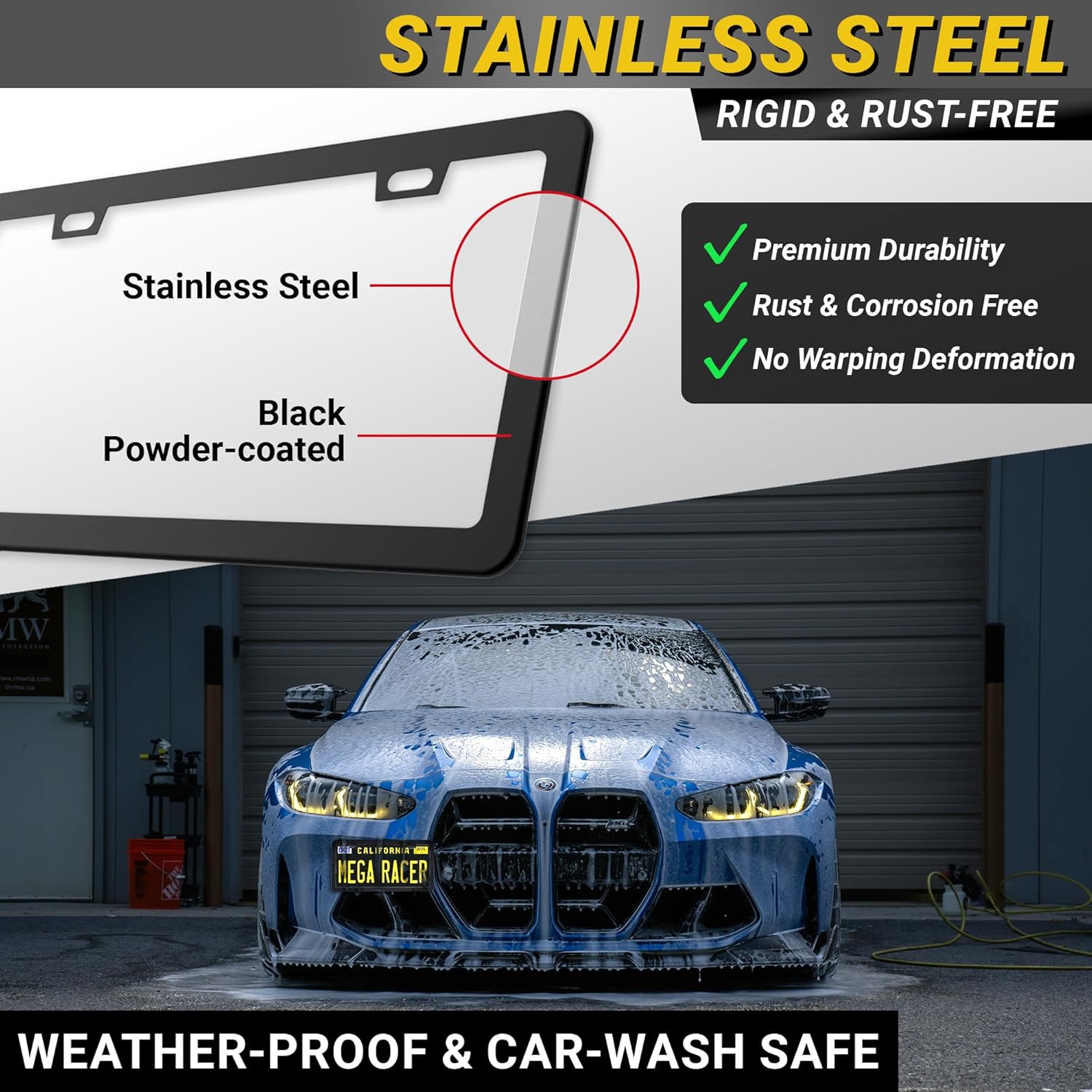 - STRONG DURABLE QUALITY: Our 1 Piece Matte Black License Plate Holder is made strong to uphold anything from car washes to weather changes. Mega Racer's black license plate frame holder are RATTLE PROOF and RUST RESISTANT keeping your vehicle paint SCRATCH FREE.