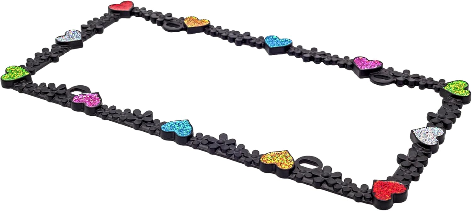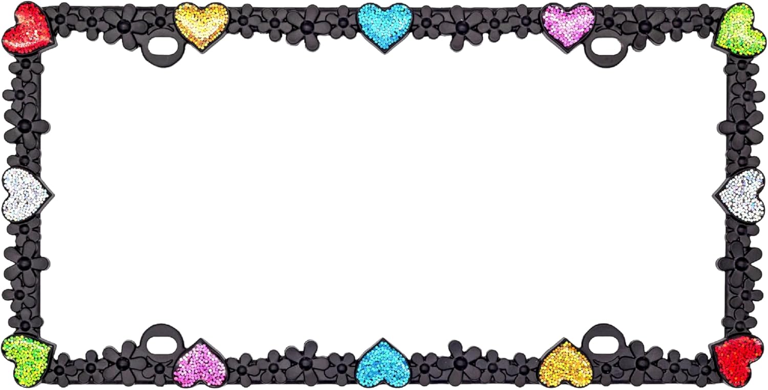 - VITALITY DESIGN - Heart and Daisy design. Matt black with silver glitter and white heart reflective stripe license plate frames. It likes a daisy chain with shining heart diamond. It makes your car feel like a princess, full of love, sweety, happiness, nature, and hope. Shining under sunshine and neon at night. Like a Starry Sky. Reflective stripe helps your car to be recognized at night. It's safer and more beautiful.