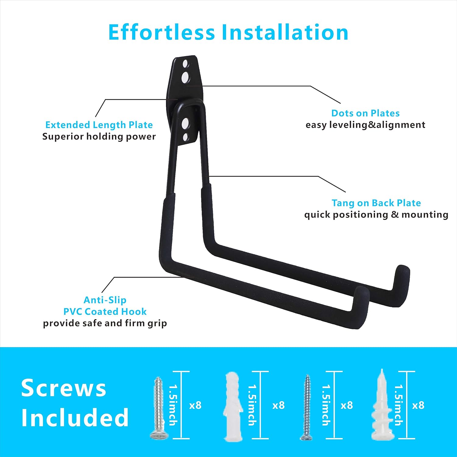 - 【Multi-Purpose】-7.5 inch length double bar hook great for hanging ladders, fordable chairs, sports gear,brooms, lawn garden tools, mowers, seasonal items or hockey sticks, and other utilities. Provide a solution for your garage storage system. Expanding your garage with our curated selection of storage hook set, which can accommodate a variety of tools and is firmly fixed. Such as ladders, garden tools, power tools, bikes, shovels, brooms, scooters, weed eater, or bulk items.