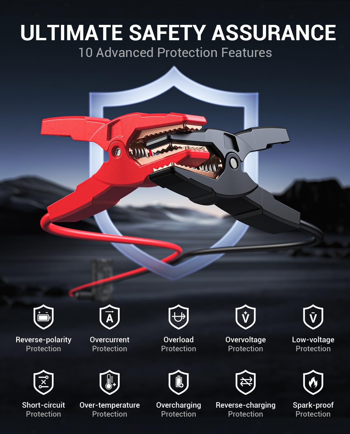 - Smart Safety Protection - The battery jump starter works with intelligent jumper clamps which provide 8 safety protections to ensure it's safe to use.​ Also, the jumper clamps indicator light will notify you of any common incorrect operating.