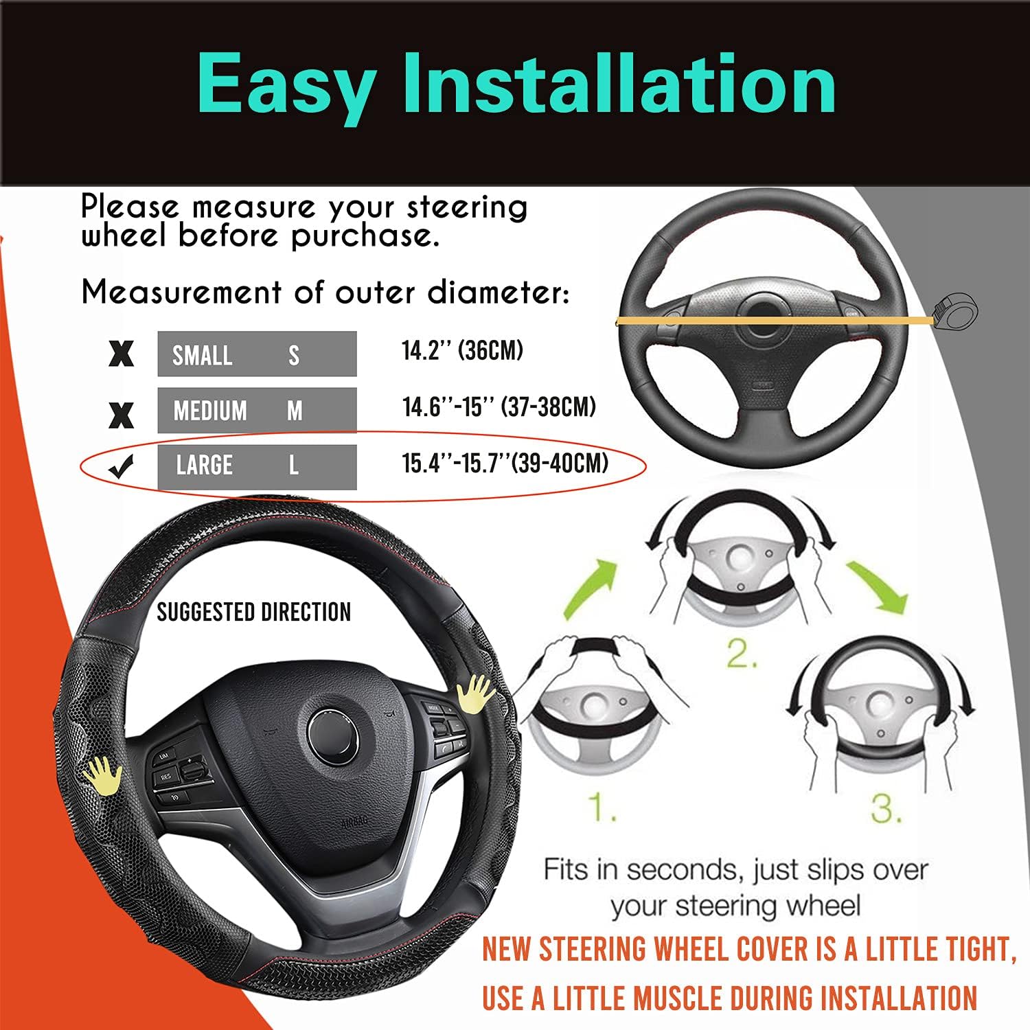 - Perfect Universal Fit: Tailored for Large Size steering wheels with a diameter of 15.5-15.75 inches (39-40cm), our cover is engineered for a snug and secure fit. During installation, a little muscle will effortlessly slip the cover onto the wheel, ensuring a seamless and reliable fit. In the case of some steering wheels with a larger grip circumference, we recommend choosing a size up for optimal installation.