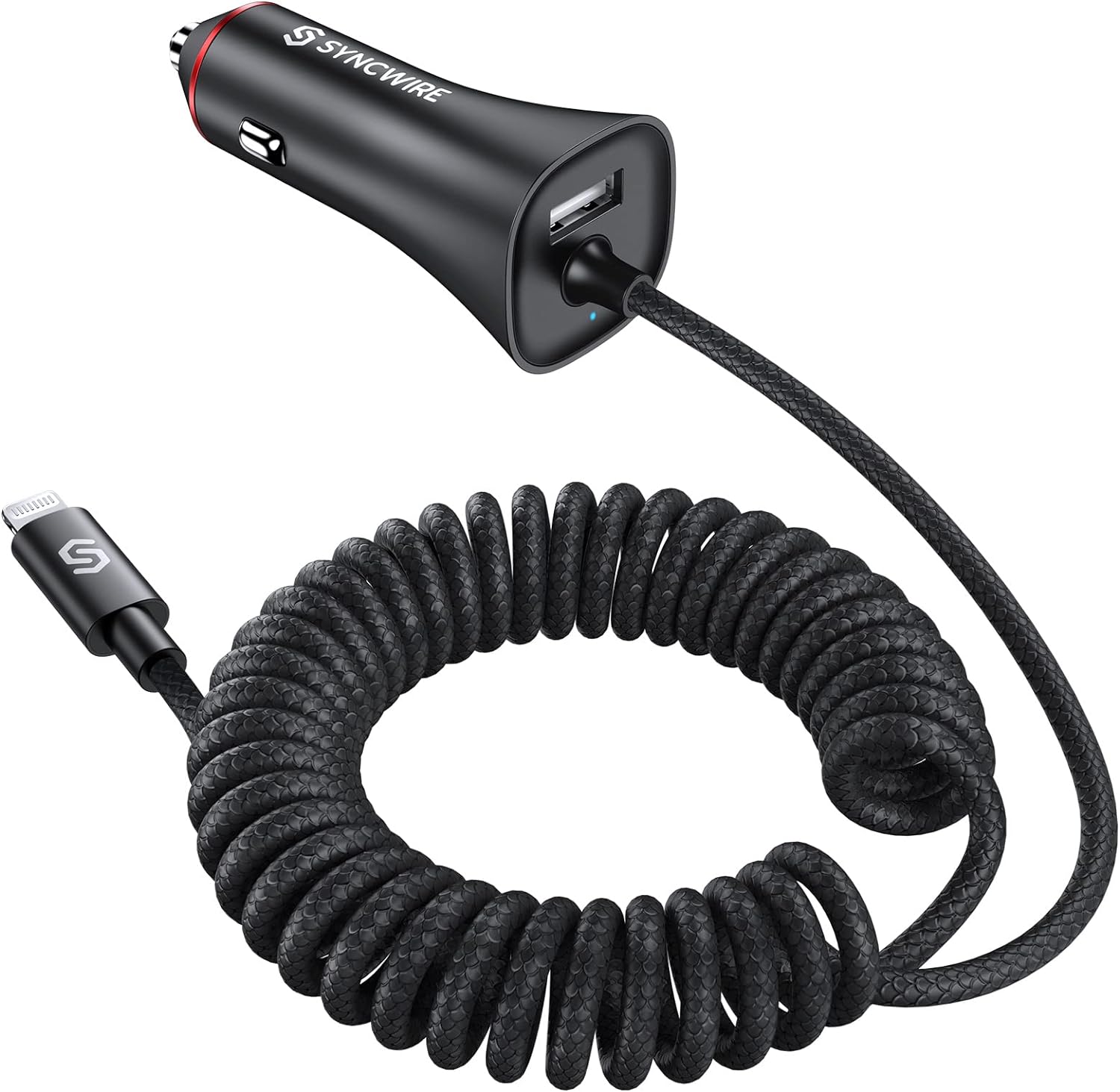 [Apple MFi Certified] Syncwire iPhone Car Charger 32W Super Fast Car Phone Charger Cigarette Lighter USB Car Adapter with Build-in 5FT Coiled Lightning Cable for Apple iPhone 14/13/12/11/XR/Max, iPad