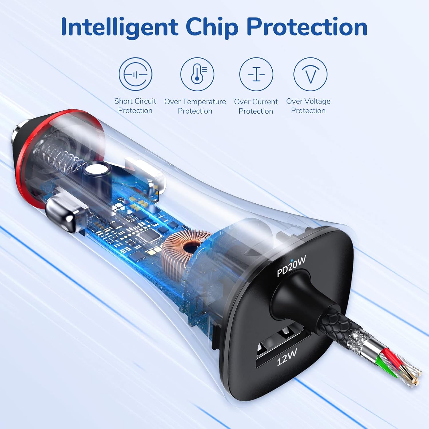 - ăLifetime reliability ăThe sturdy polycarbonate shell, The built-in "smart IC" & the thermal material design keep the car adapter going against overheat and over-load on the unit and over-charge onto the devices. The blue LED indicator tells you that Syncwire car Charger is ready for charging!