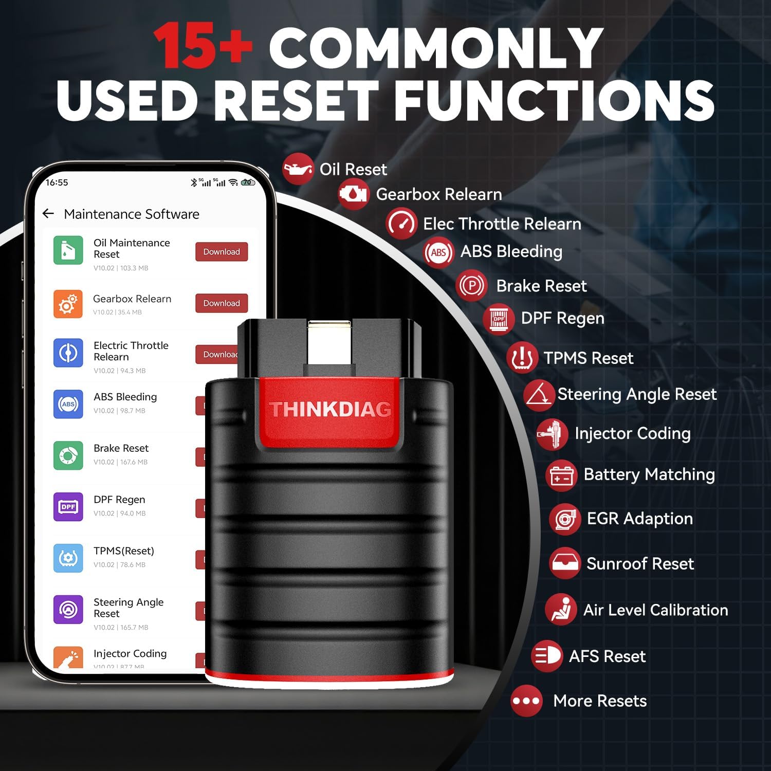 - ăđ§ 15+ Advanced Reset & Calibration FunctionsăThe Thinkdiag scanner provides 15+ professional maintenance functions, including:â Oil Reset | â ABS Bleeding | â Injector Coding | â SAS Resetâ TPMS Reset | â BMS Reset | â Transmission Adaptation | â AFS Reset | â Sunroof Calibration | â Brake Reset | â Suspension Relearn | â Electronic Throttle Relearn | â Seat Calibration | + More reset/relearn/calibrate/adaptive functions under automotive full systems diagnostic menu. Ideal professional OBD-II scanner for mechanics and DIY enthusiasts, Thinkdiag delivers factory-level diagnostics with adaptive relearn capabilities for precise vehicle servicing.