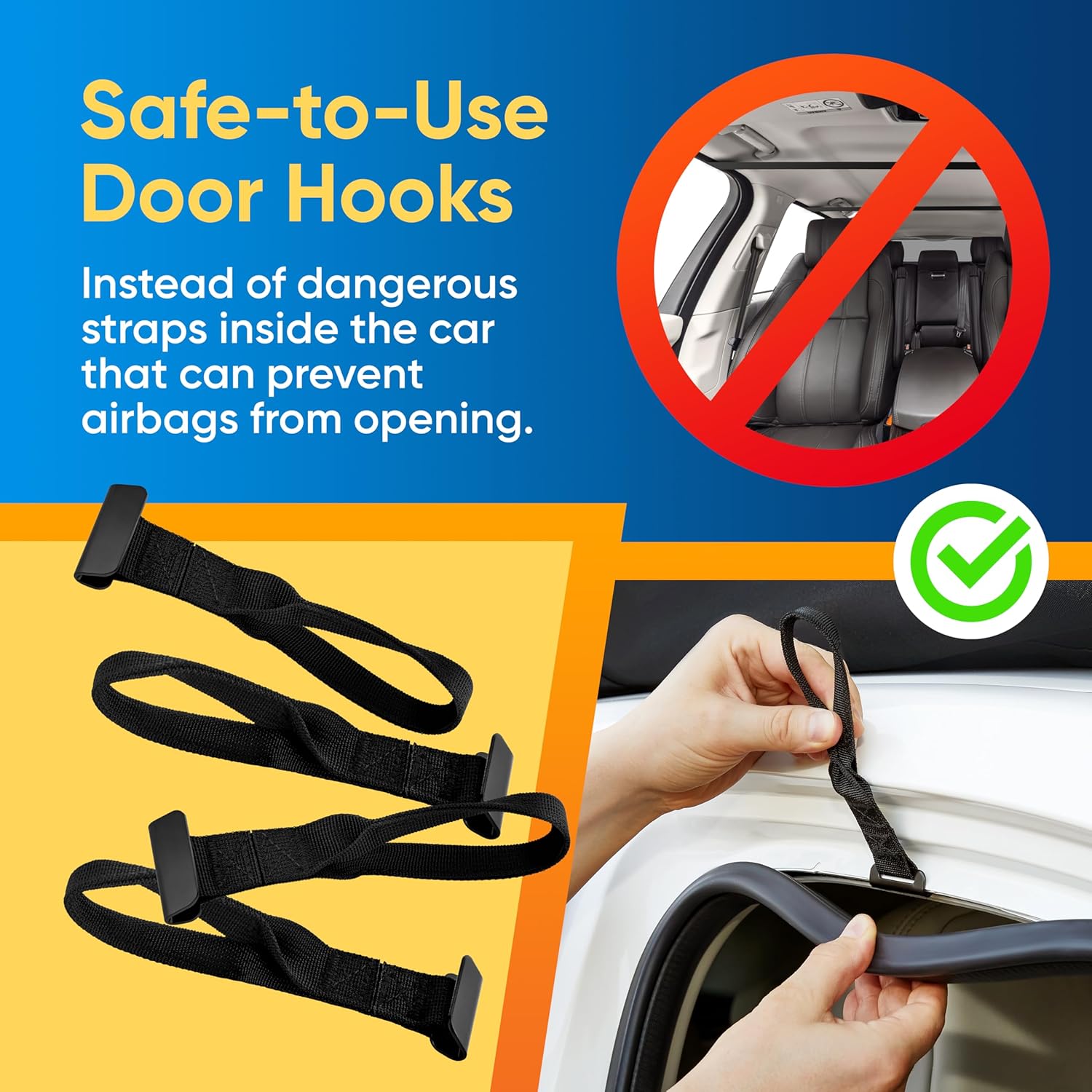 - SAFE AND EASY TO USE FOR ANY VEHICLE. Designed with your safety in mind, this car top carrier without a roof rack includes heavy-duty straps and secure door hooks that won’t interfere with airbags. Whether you’re using it as a roof rack cargo bag or attaching it directly to your car, our BagMate ensures a smooth and secure ride.