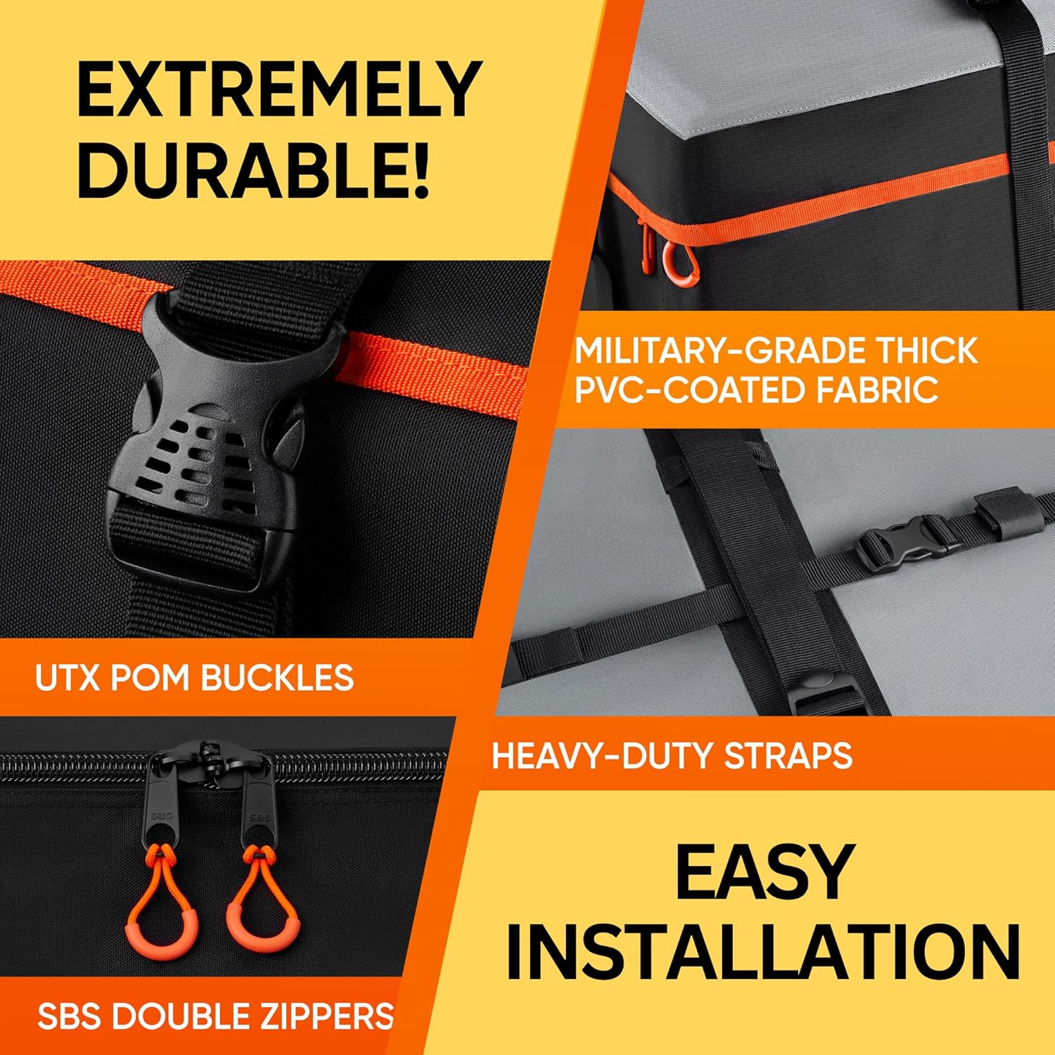 - DURABLE AND RELIABLE SUV ROOF BAG. Crafted for durability, this SUV roof bag works for any vehicle, with or without a rack. Use it as a roof rack cargo bag or attach it securely using our door hooks. Reinforced SBS double zippers and UTX POM buckles ensure your belongings stay safe during every journey.