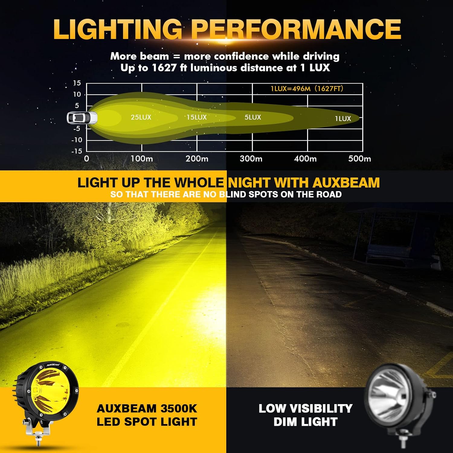 - 【Commit to Service Excellence】Upgraded package comes with 1x DT connector wiring harness-2 leads, 2x 4inch led offroad lights, 1x installation accessories. Please feel free to contact us if you need any assistance, Auxbeam Team guarantees a 24 MONTHS WARRANTY and 24 HOURS online friendly customer service response.
