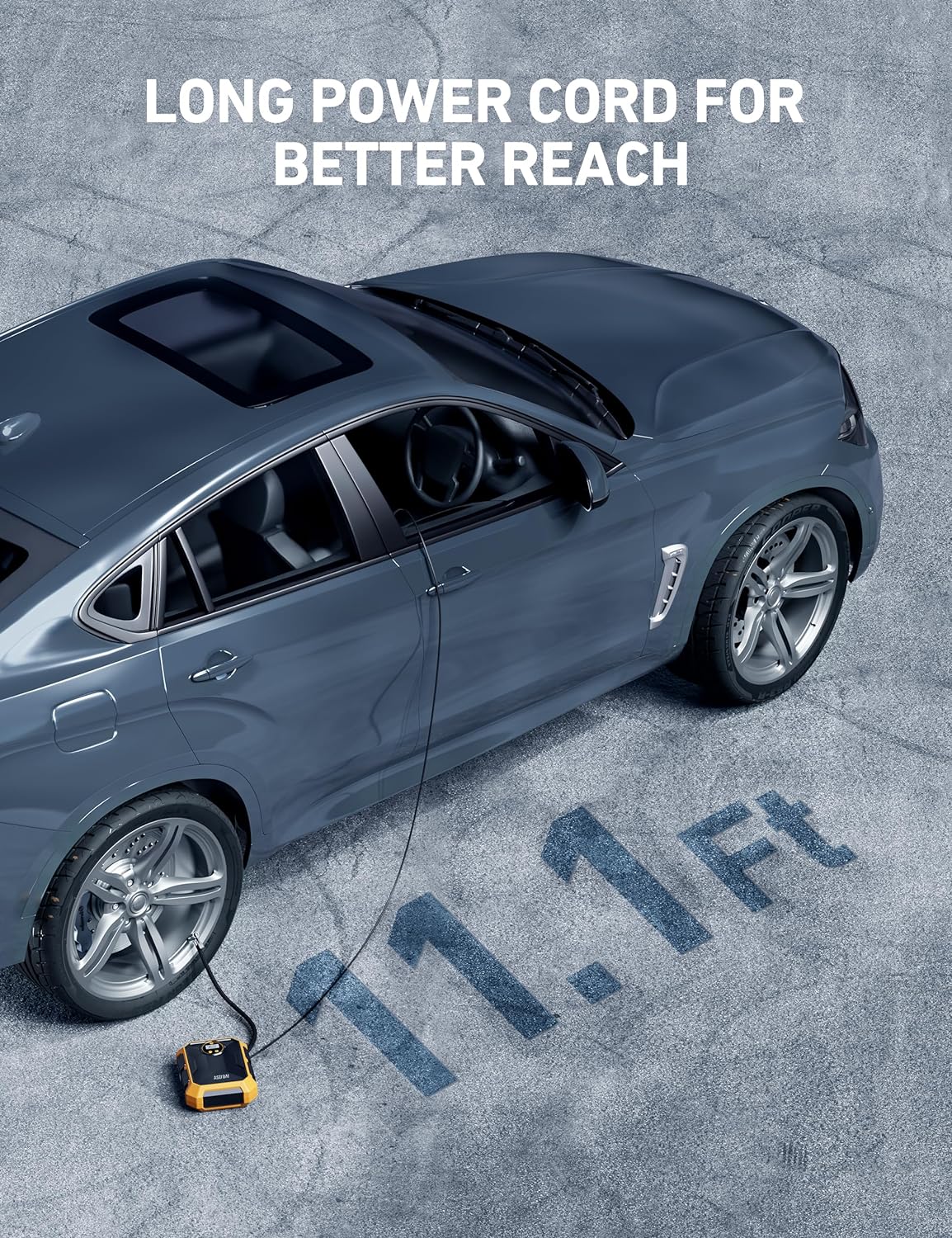- Ultra-long Power cord & Compact: The power cord plus inflation cord totals 11.1ft long overall length gives easy access to the front and rear tires, saving you time and energy. The compressor’s compact size allows it to be easily stored anywhere in a vehicle. Even though it's compact, the air compressor delivers fast inflation.