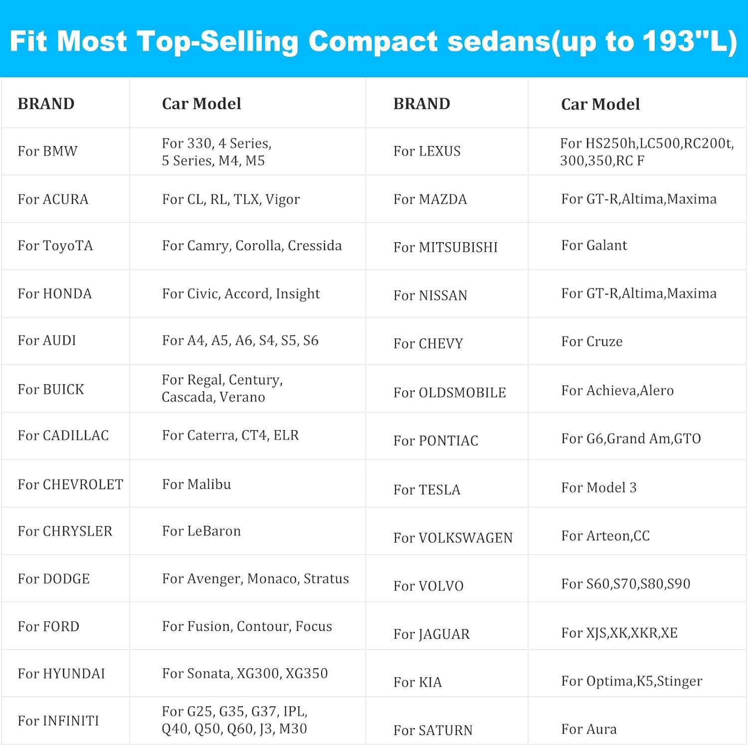 - ăUniversal Vehicle FităUniversal Car Cover fits Toyota Corolla/Honda Civic/Sentra/Ford Focus/Chevy Cruze/BWM 330/Audi A4. Size: 193''(L) x 70.8''(W) x 59''(H). Confirm your car model and dimensions before ordering. Note: Ensure dry car body before use.